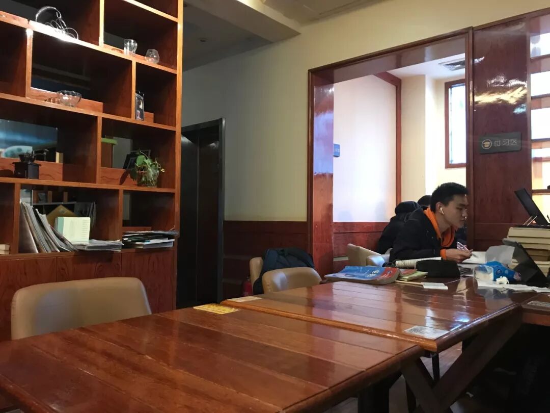 咖啡馆内可以聊天,比较适合小组讨论,最吸引大家的当然还是餐饮需求可以随时满足,饿了困了都不是事儿。但这类场所一般离宿舍区较远,座位灯光不是特别明亮,容易被周围事物打扰。