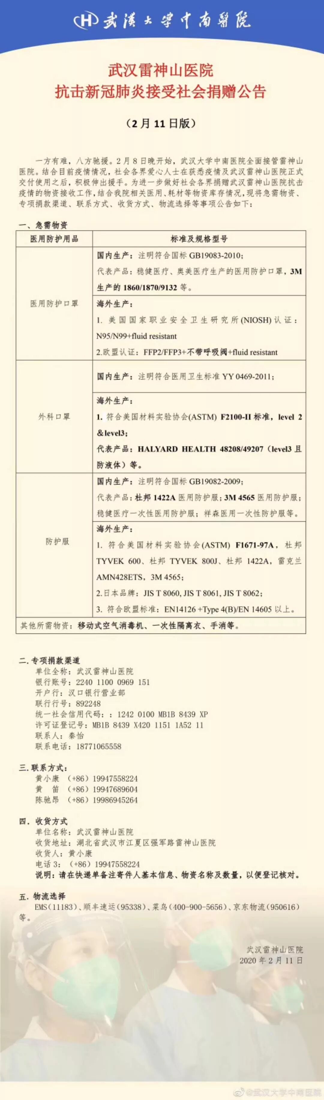 武汉雷神山医院抗击新冠肺炎接受社会捐赠如下,让我们聚沙成海,为“白衣战士”送上“武器”,齐心协力。共渡难关。