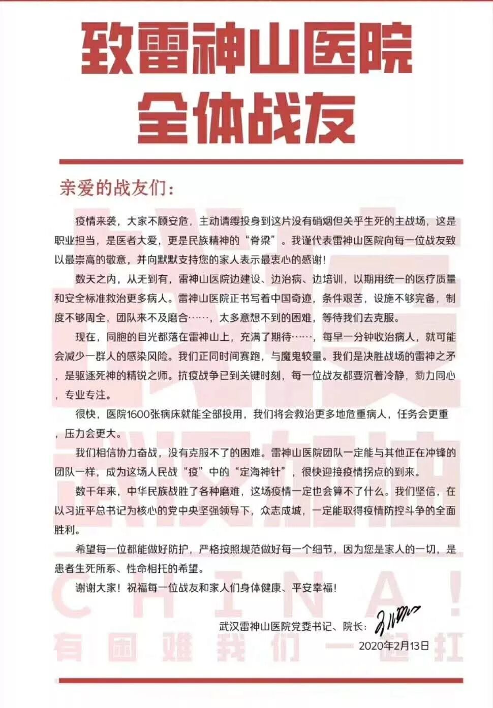 疫情如火,迫在眉睫。武汉大学中南医院院长,武汉雷神山医院党委书记、院长王行环发表“致雷神山全体战友的一封信”,号召全体医护人员众志成城,坚决打赢防疫阻击战。