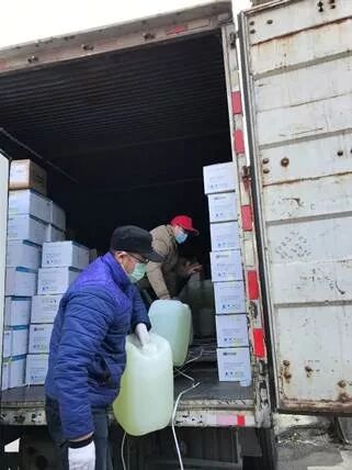 开私家车接北京校友会捐赠的500桶消毒液进校。
