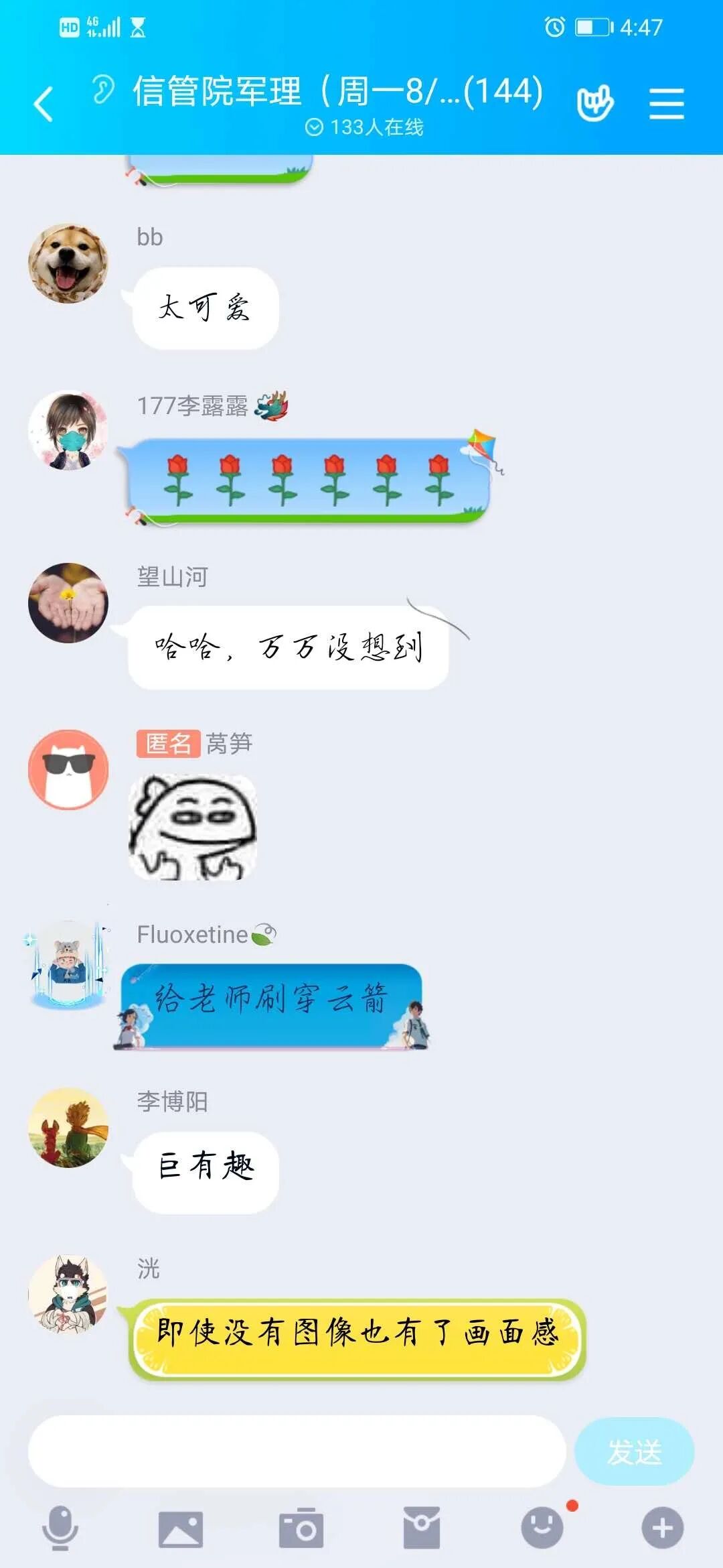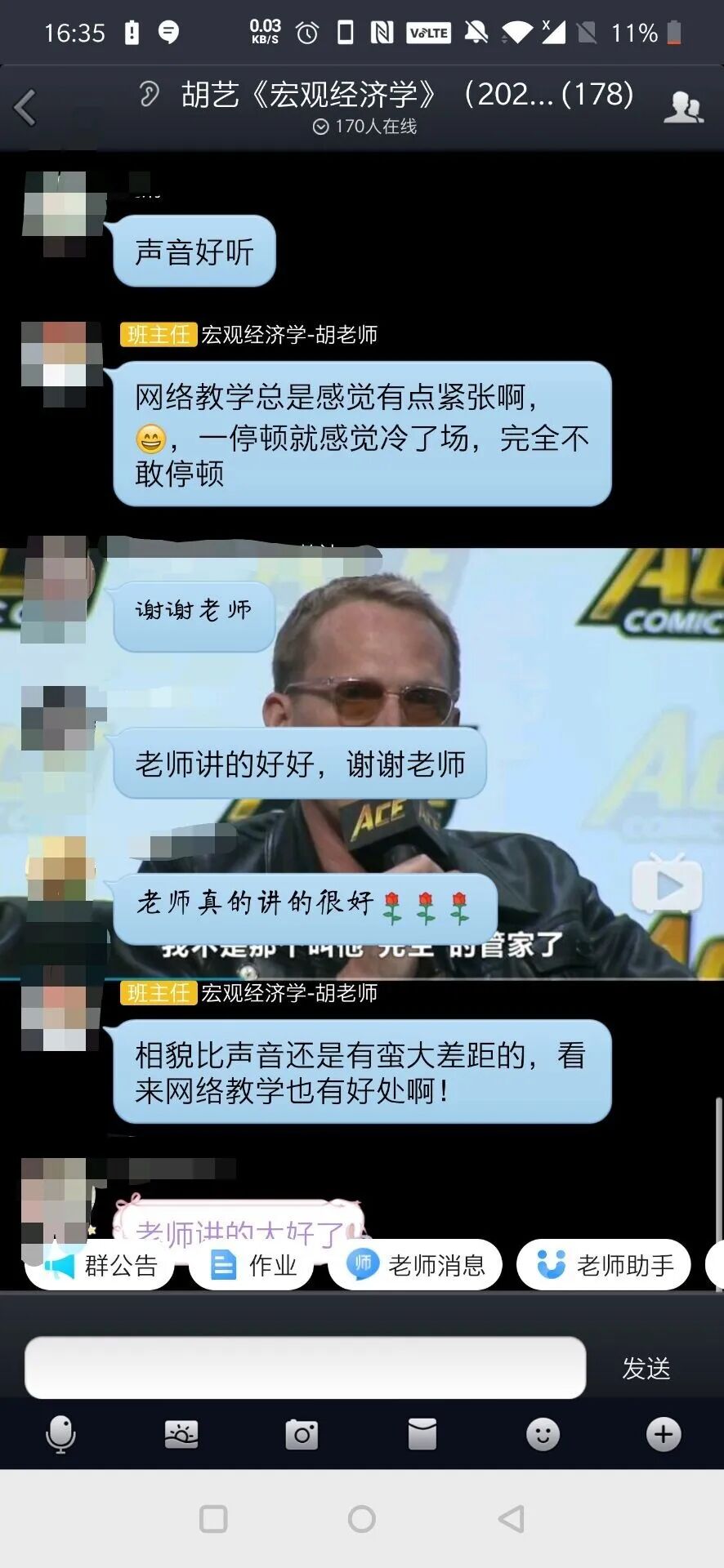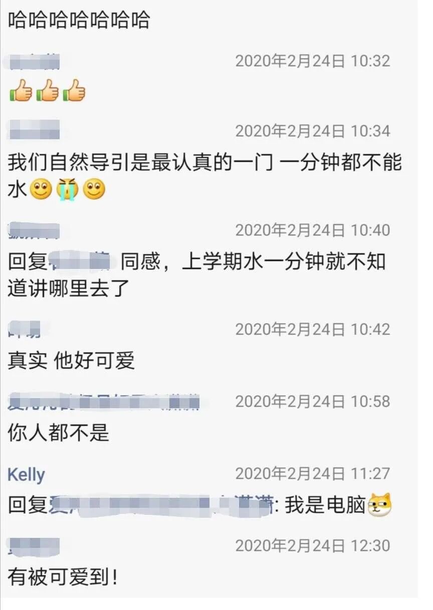 (呜呜呜他把单身狗骗进来杀)讲课时一本正经地给我们科普排雷,讲的化学知识也很有用,与生活贴近,满足了我们的好奇。群里有好多外校的同学来蹭课,大家都说要藏好我们的宝藏罗老师不然被抢走啦,还有同学说“老师快出道吧”哈哈哈。最让人感怀的还是对化学的情愫吧,高三把水泥陶瓷成分背得滚瓜烂熟,大学读了社科后以为就此和化学道别,却遇见了这门课,真是意外之喜,当然最大的宝藏还是老师啦!