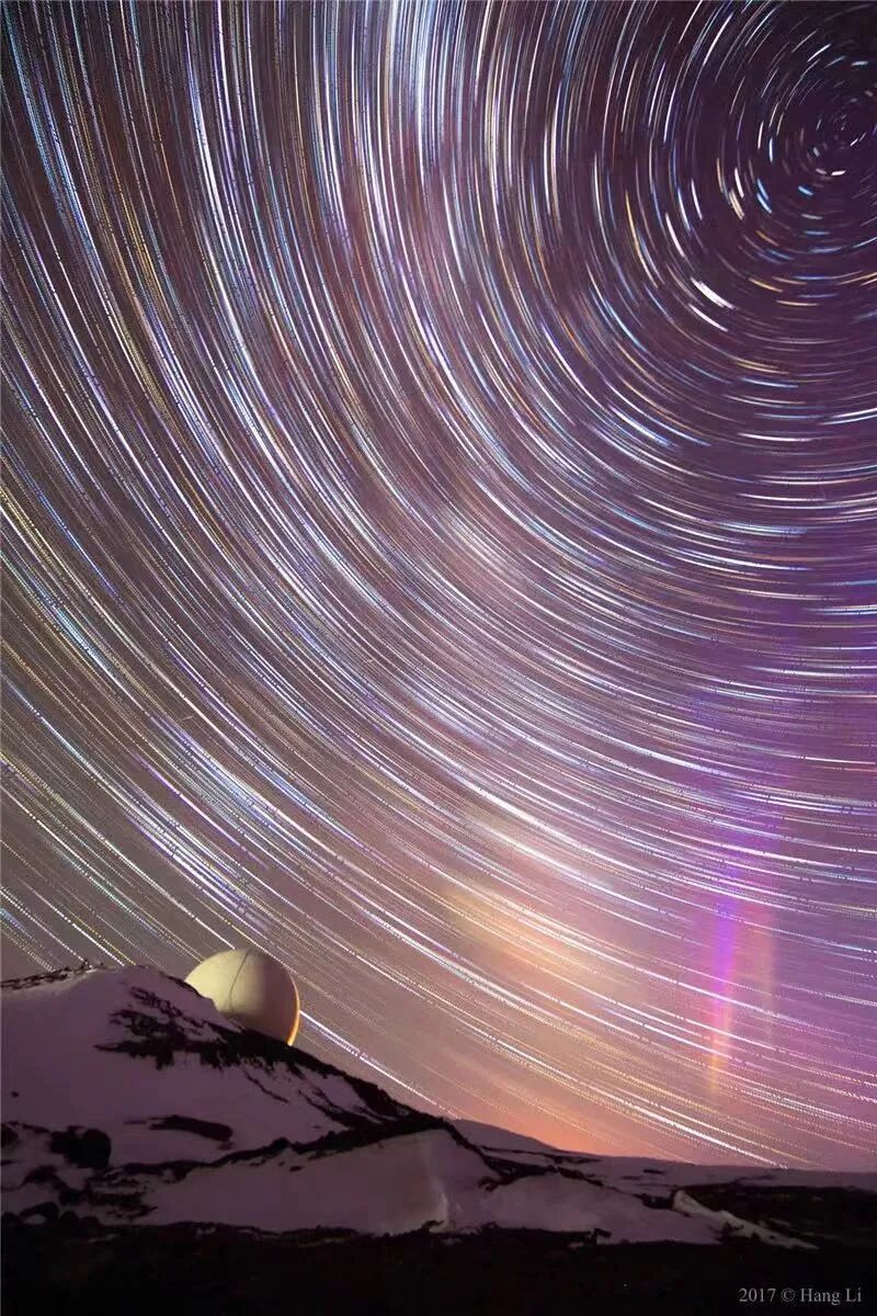▲卫星天线球上的极光和星轨