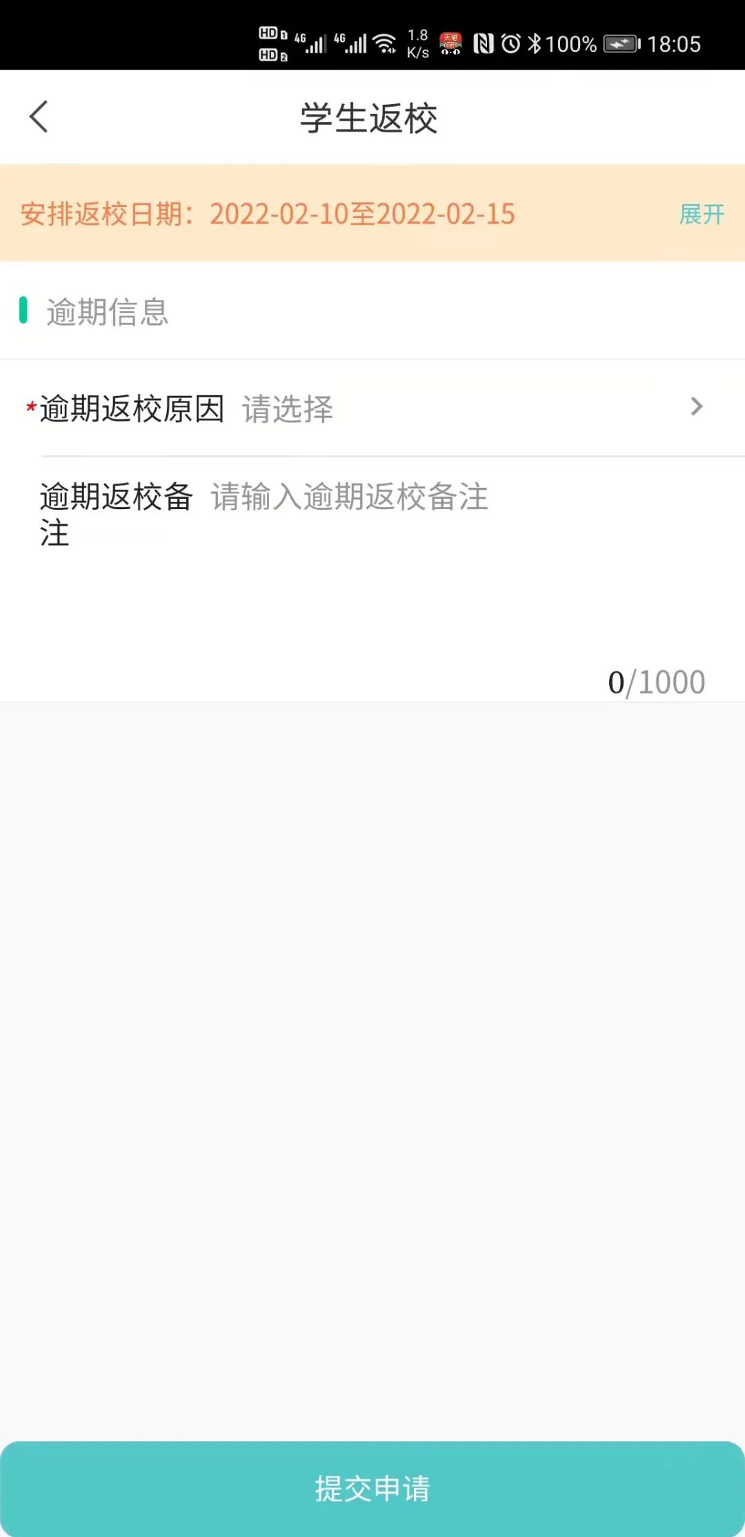2、在返校告知书页面勾选我已阅读,如能正常返校,点击“我可以按期返校”;否则点击“我要逾期返校“,填写逾期返校原因及备注后“提交申请”即可,申请至此中止,待能正常返校后按学校安排再行申请返校。