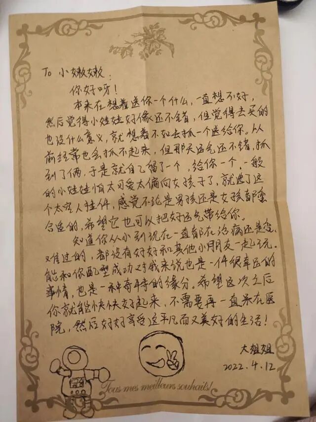 白枭回赠给患者小嫩嫩的的玩偶和信