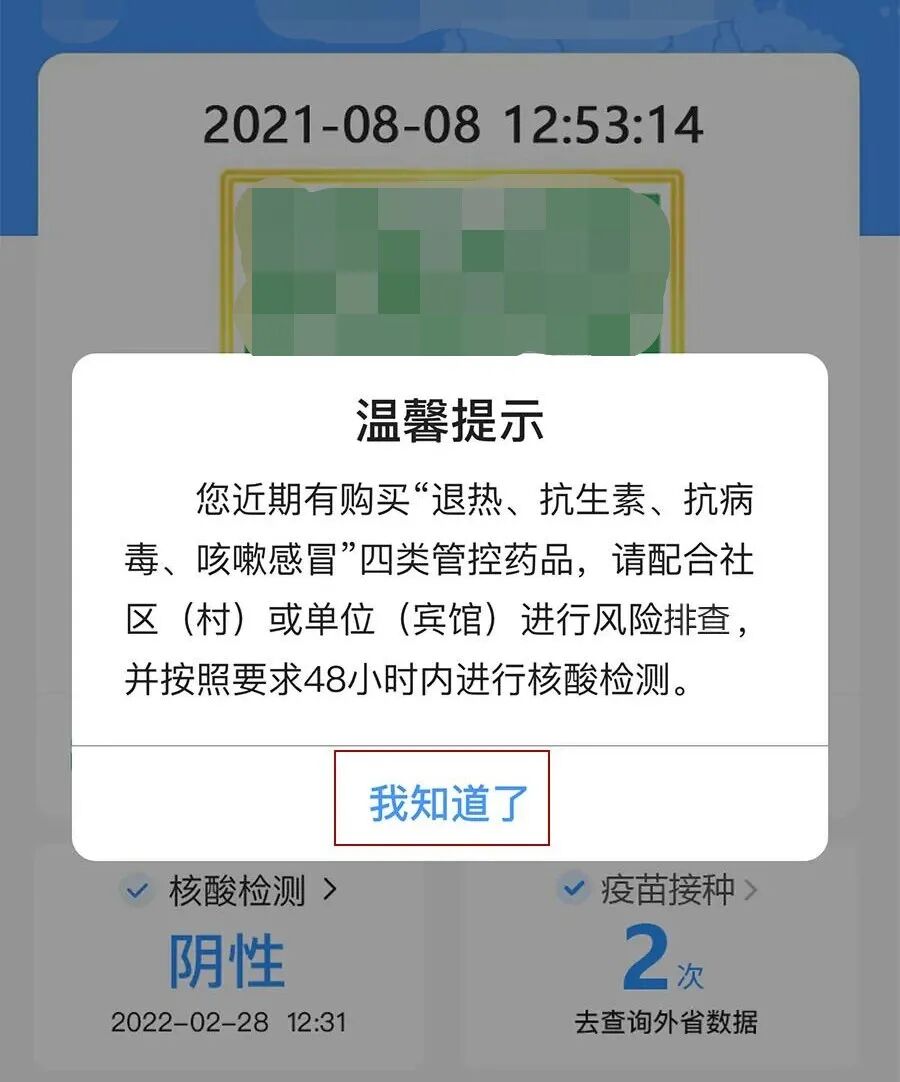 为进一步完善疫情防控零售药店预警机制,实现对高风险人员的源头管控,购买“四类药品”(退热、抗生素、抗病毒、咳嗽感冒药品)的人员,打开健康码将收到弹窗提示。