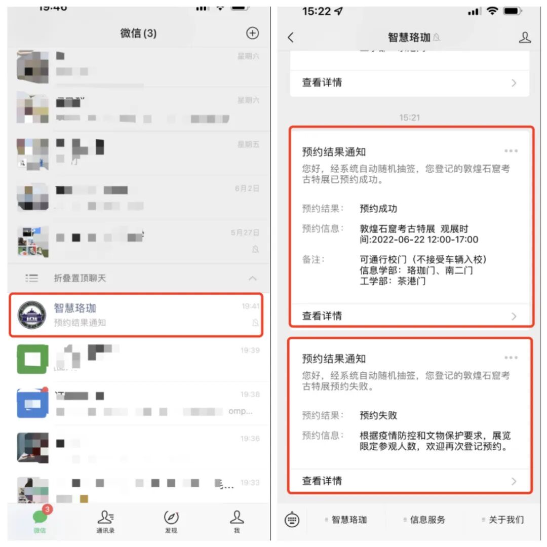 通过智慧珞珈公众号登记预约的用户,智慧珞珈公众号每周五会自动推送本周次登记的预约结果到微信消息页面,如下图: