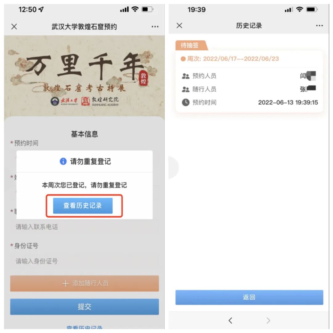 关注武汉大学万林艺术博物馆微信公众号或智慧珞珈微信公众号,进入公众号页面,点击下方菜单栏,展开功能列表,点击敦煌石窟考古特展进入系统首页,也可以进行登记预约。