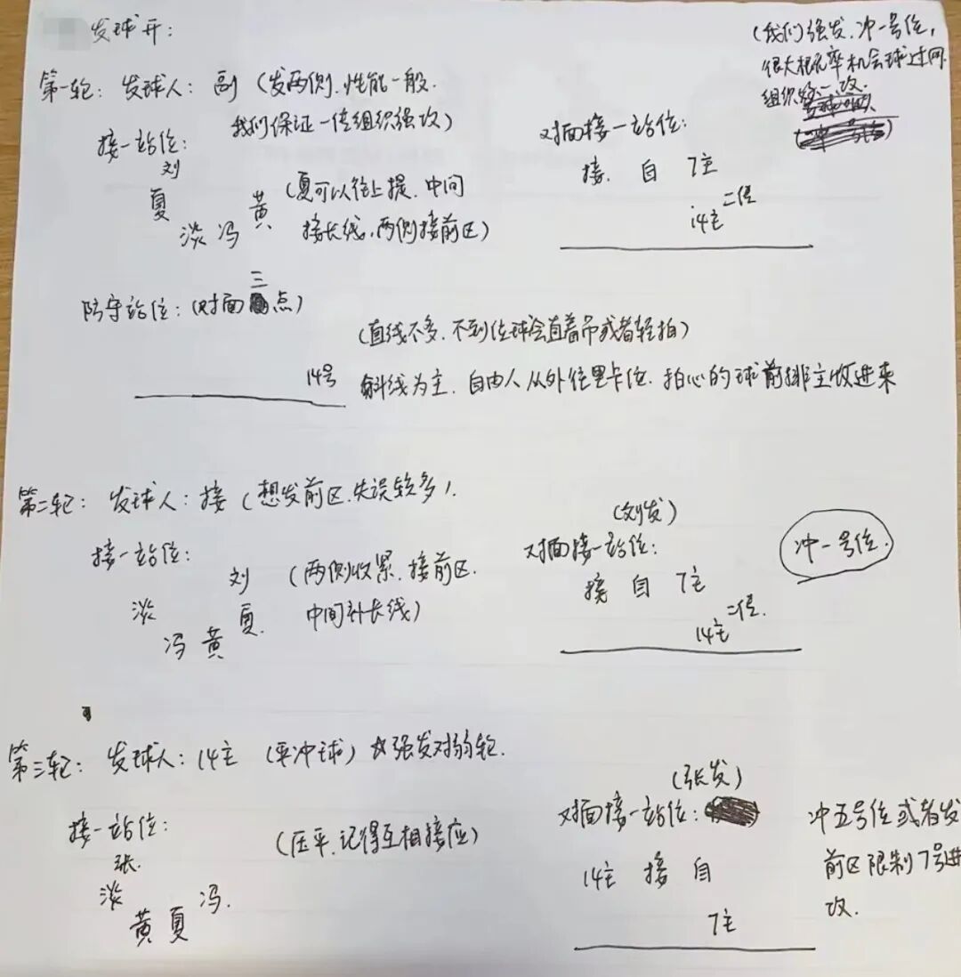 武汉大学阳光女子排球队的队员黄凡珂为我们分享了一张轮次表,这是决赛前针对对手的比赛的习惯特点等,队员黄琦为大家所制定的。