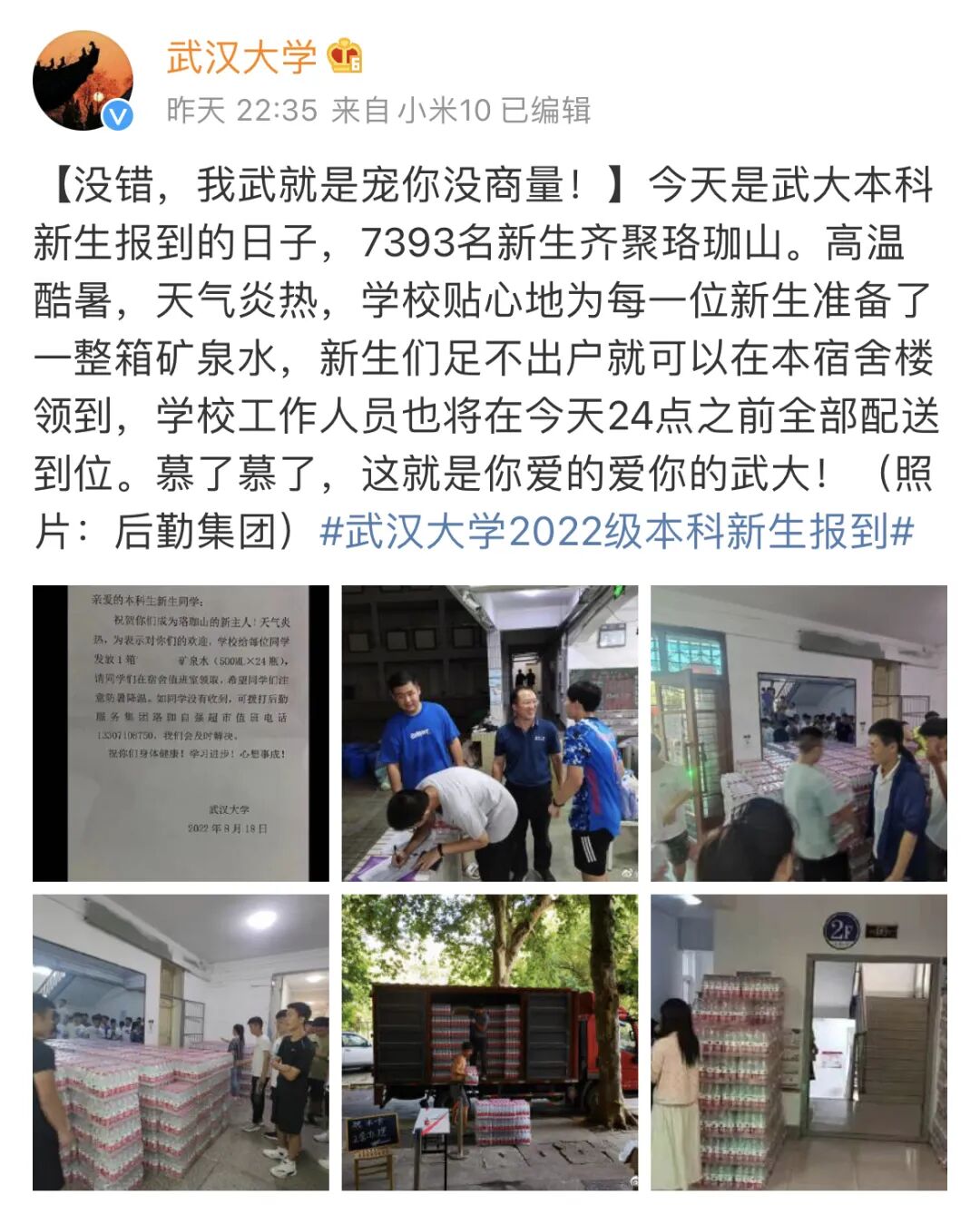 “在这热烈的夏日,我们走进了武大的校园。烈日灼心,兴奋之余也难抵热气。感谢学校在此时刻贴心准备饮用水,给我们的入学生活增添了凉意。”