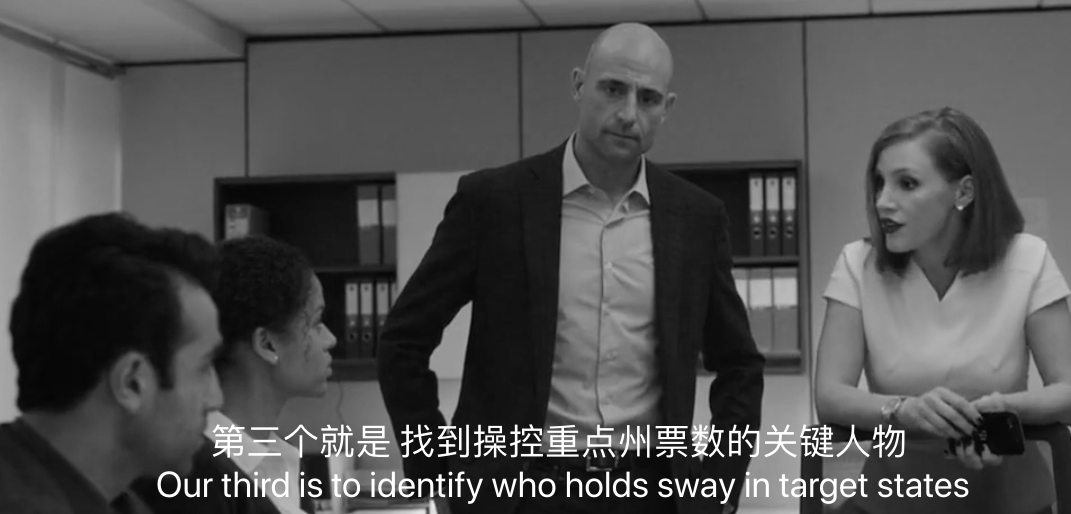🎬 电影《斯隆女士》(Miss Sloane)中的台词提到:Our third is to identify who holds sway in target states 第三个就是,找到操控重点州票数的关键人物。