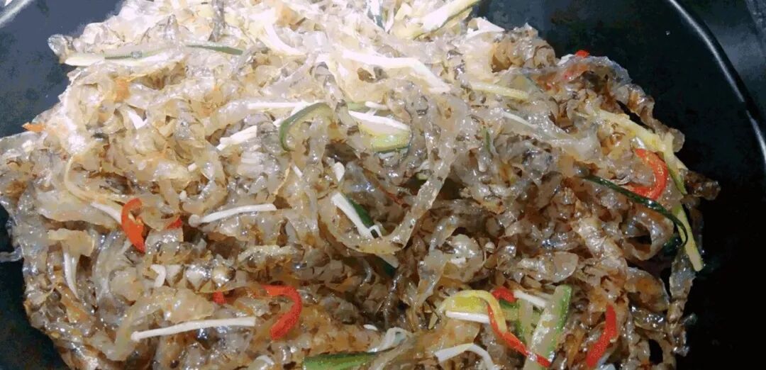 新鲜的鱼皮要用烈日曝晒,晒到硬挺,用手指弹之有“铿铿”金属声才好。这种鱼皮既能长久保存,其鲜味物质氨基酸又能在保存的过程中慢慢熟成释放。临吃的时候,用水泡发,已褪去新鲜时的鱼腥,却保留了柔韧弹牙的口感,就好像三十多岁的少妇,褪去了少女的青涩,却依然有着年轻姣好的面庞。