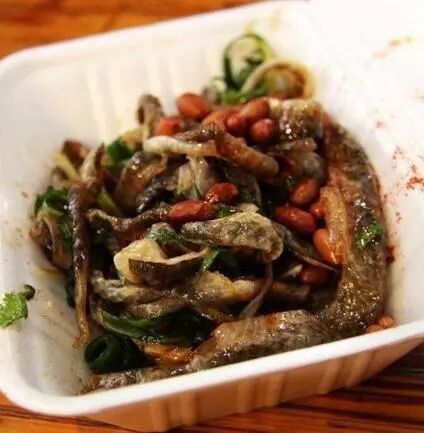 青皮是脊背皮,颜色青黑。这种皮比较厚,口感弹牙,适合凉拌。广州西关陈添记铺子里的当家小吃凉拌鱼皮,正是用且成小宽条的青皮,加花生、芝麻、香菜、蒜末、香醋做的,蔡澜对这东西赞不绝口,称他比蛇皮都好吃。这位生长在粤菜系统中的美食家,是真的懂行。
