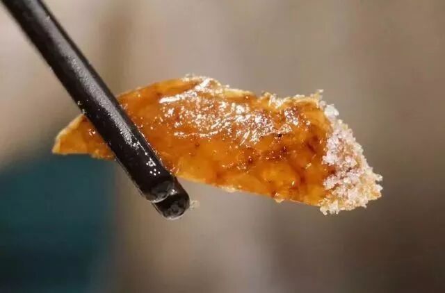 最后一步是甜皮鸭的关键:趁鸭皮表面的油温高,还没冷却的时候,刷上饴糖。这让鸭皮颜色更红,质地更酥脆,即便冷却之后,也不会回软。香甜的口味,与大董出品的烤鸭皮蘸白糖不谋而合。