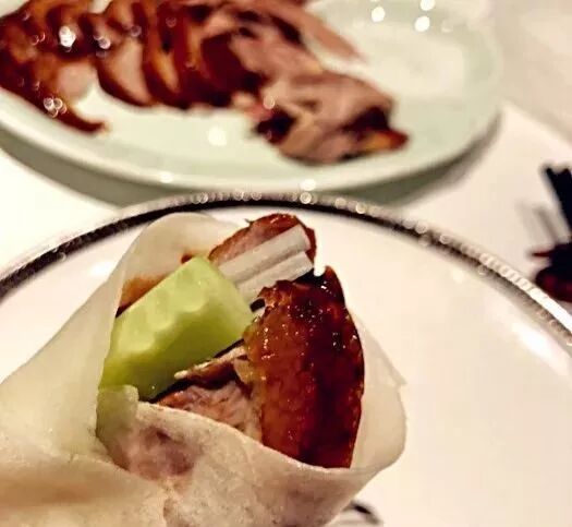 北京烤鸭独到的吃法:面酱、大葱、水萝卜丝、黄瓜丝、带皮鸭肉卷荷叶饼,一方面源自影响京城饮食最深的鲁菜师傅的手艺——大葱、面酱、面饼,都是山东常见的配菜;另一方面,它又是为焦脆的挂炉鸭量身定制的。大葱和蔬菜平衡了油腻,面酱提供了甜鲜味,面饼又让烤鸭的吃法充满仪式感,并提供了垫饥的淀粉。