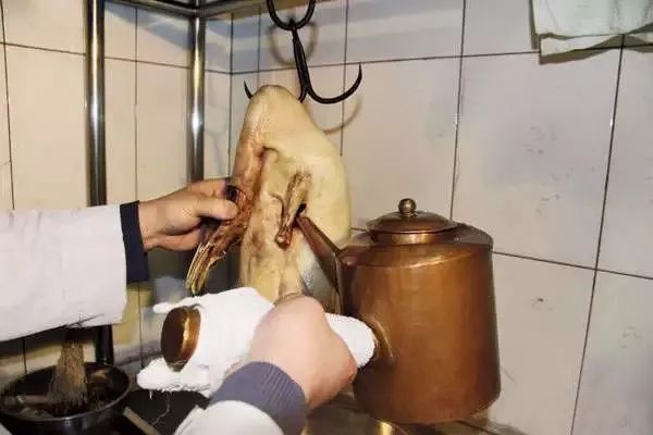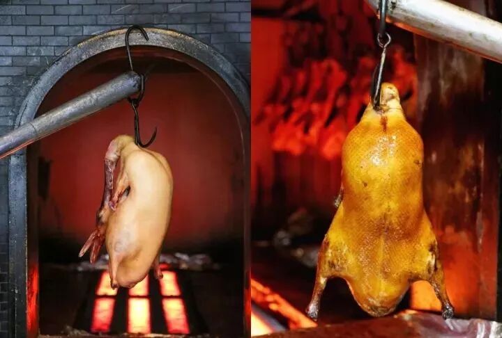 首先是做法,南京鸭以传承自南宋的焖炉为特色,但北京鸭却发展出了以全聚德为代表的挂炉鸭。所谓挂炉,是指烤炉没有炉门,鸭子用长长的挑杆挂着送进炉内,随时可以翻转查看,保证受热均匀。