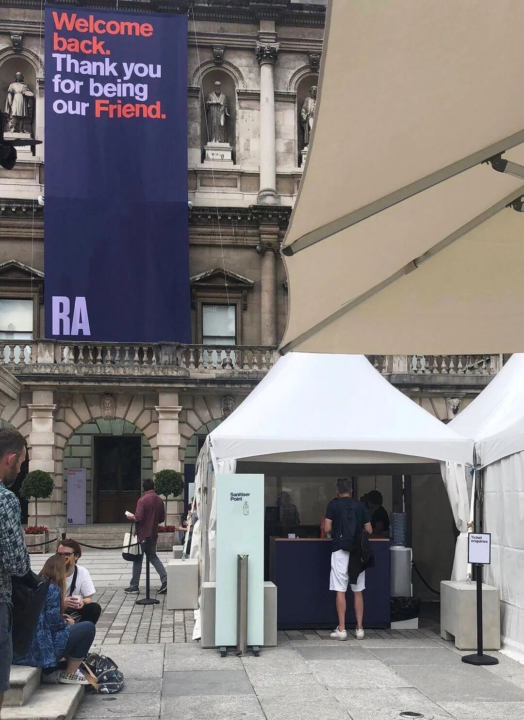 Royal Academy of Art的毕加索展览则是我的意外收获。这个展览计划复工后两周就会换上来自丹麦Ordrupgaard收藏的高更和印象派的新展。限流加上展期很短,所以票一下就售罄了,我选了一个工作日去Mayfair逛画廊,顺便碰碰运气,看看能不能现场买到票,没想到真的买到了。刚刚复工的RA关闭了一个入口,并把售票口和检票口改到了院子中庭。在众多志愿者的帮助下,进到RA院子的观众被很有秩序地分流。买不到票的人也被推荐到RA中庭的咖啡厅喝一杯咖啡,点一份蛋糕,度过一个午后。和National Gallery相比RA的展厅内确实更多人,但99%都戴了口罩。可能是工作日的缘故,展厅中很多老年观众。