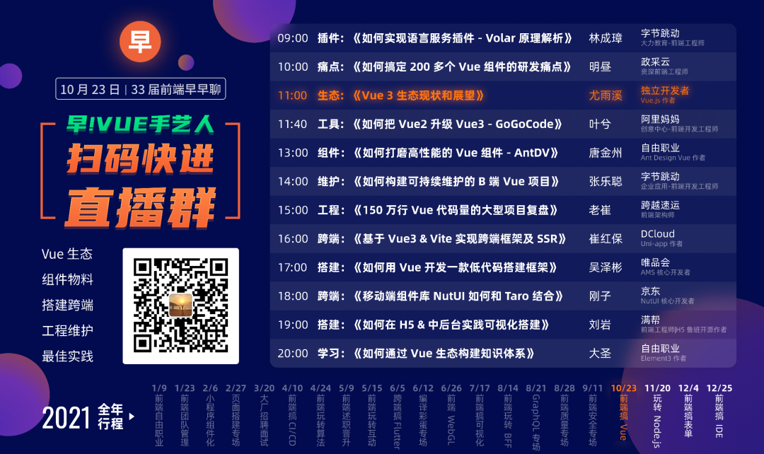 免费观看10月23日的前端早早聊Vue 专场直播,大咖云集️,更有「尤雨溪」分享「Vue3 生态现状以及展望」。 另外还可以送50个录播视频和PPT~