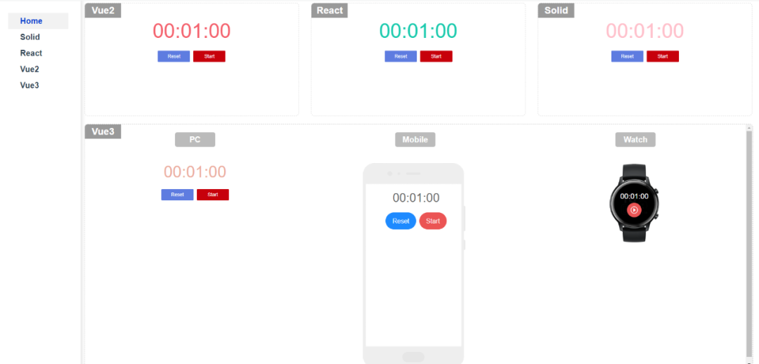 pnpm dev启动后会总共启动5个工程,1个主工程和4个子工程,其中4个子工程分别引入了不同框架的组件库,但是不同框架的组件库复用了同一份交互逻辑代码和样式文件。