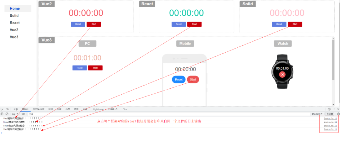 我们可以点击按钮然后会在控制台打印,当前复用逻辑层是来自哪些不同的框架的: