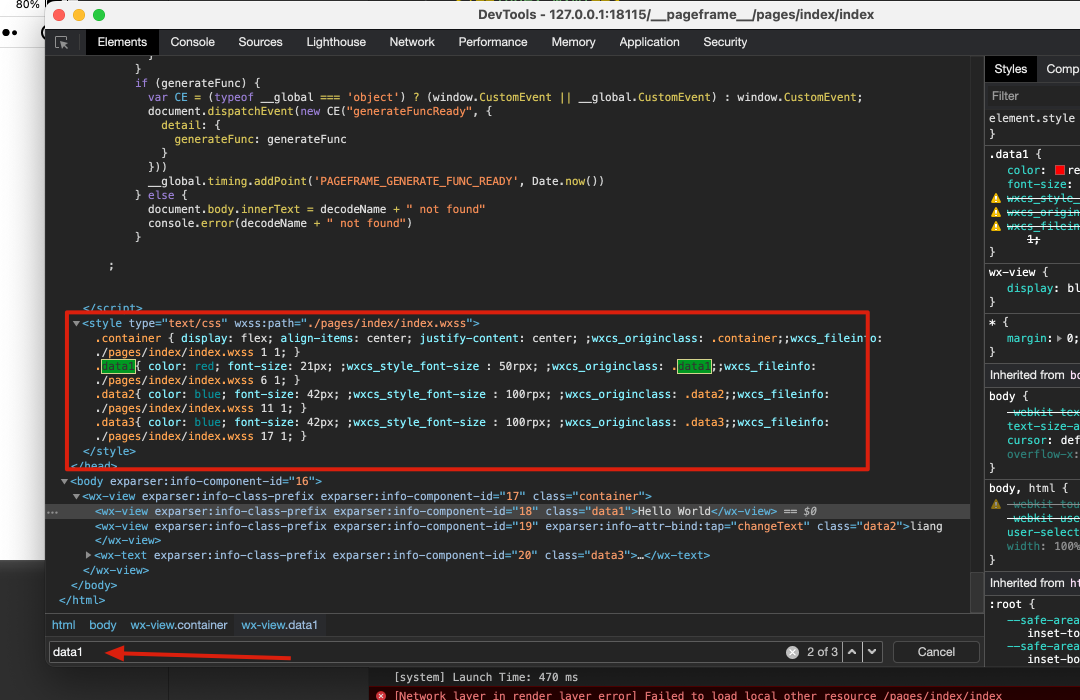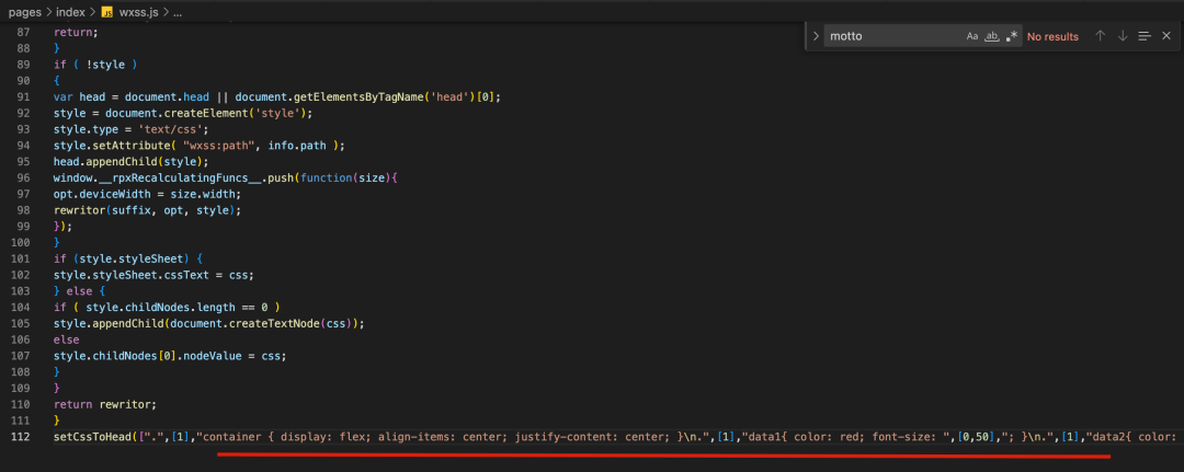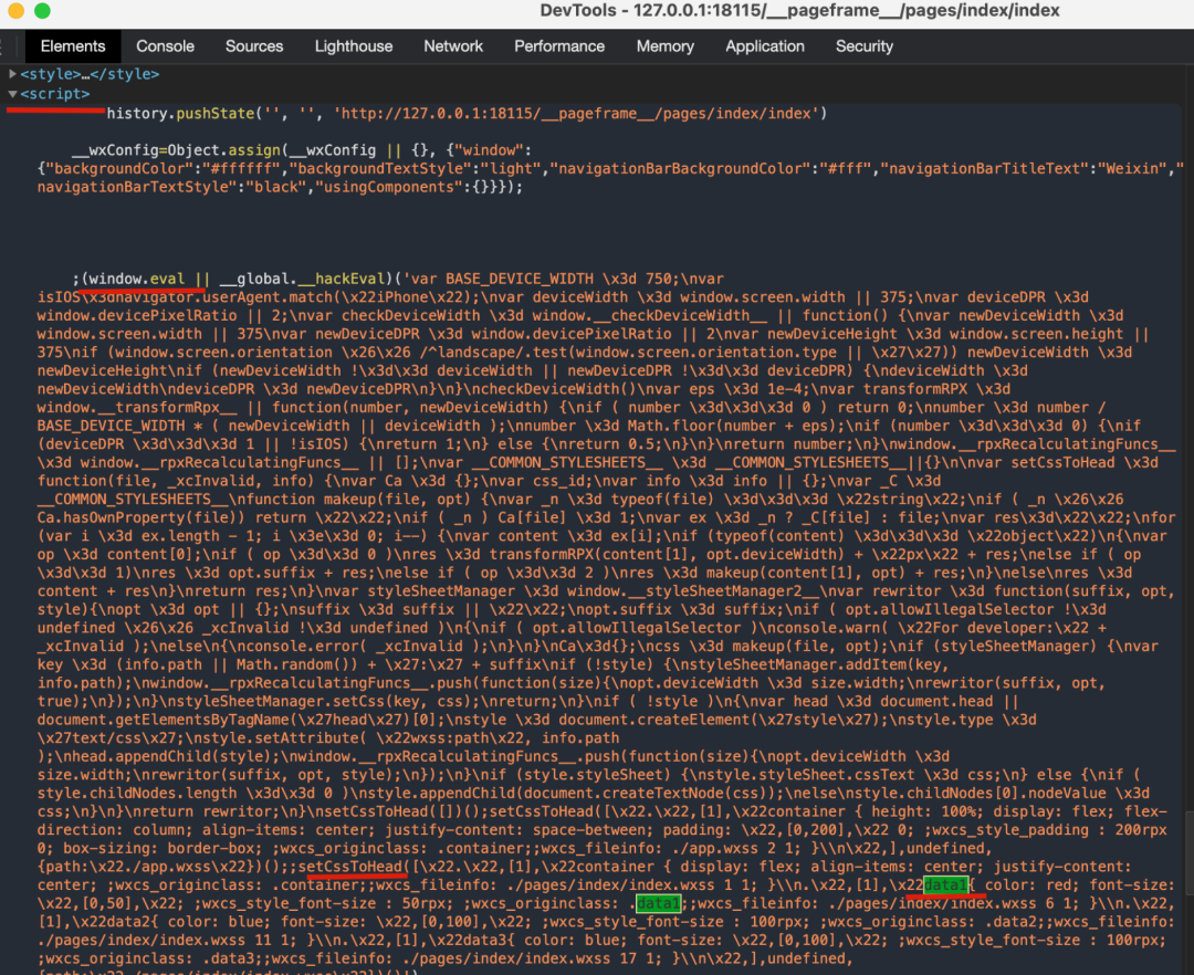 因此对于代码 wxss 到显示到页面中就是三步了,第一步是编译为 js,第二步将 js 通过 eval 注入到页面,第三步就是 js 执行过程中把 rpx 转为 px,并且把 css 注入到 style 标签中。
