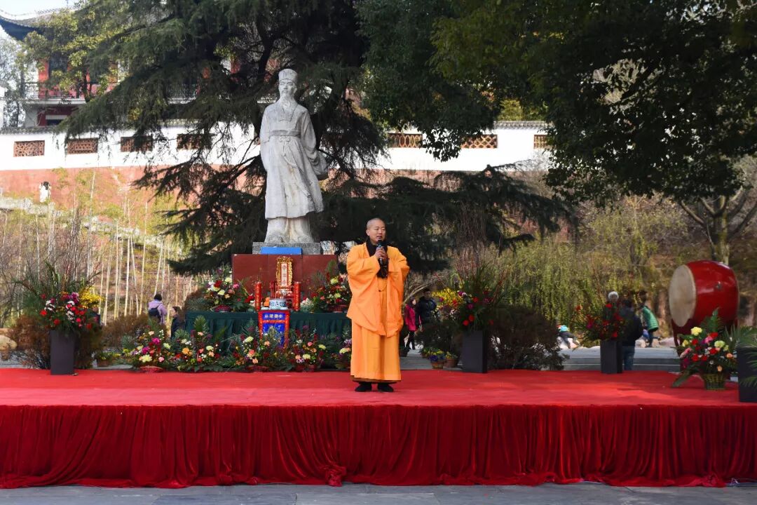 “子瞻苏长公,文章独步称雄,浩然天地秉清风,一蓑烟雨飞鸿。历历劫波游沧海,弹指际断三生,休言万事转头空,了了浑如梦。”上午十时,在庄严悠扬的梵呗声中,中国佛教协会副会长、湖北省佛教协会会长、黄梅五祖寺方丈正慈大和尚,中国佛教协会副会长、河北省佛教协会会长、赵州柏林禅寺方丈明海大和尚,震旦佛教艺术研究院副院长利生法师带领大众于东坡道影前,一同诵经,纪念东坡先生。此次诵经仪轨的赞辞均取材于苏东坡关于参禅的佛理诗词作品,苏轼因“乌台诗案”被贬黄州,在忧郁压抑的人生低谷,来到城南的安国禅寺,“焚香默坐,深自省察”,终至“物我相忘,身心皆空,求罪垢所从生而不可得,一念清净,染污自落,表里倏然,无所附丽”的禅境。
