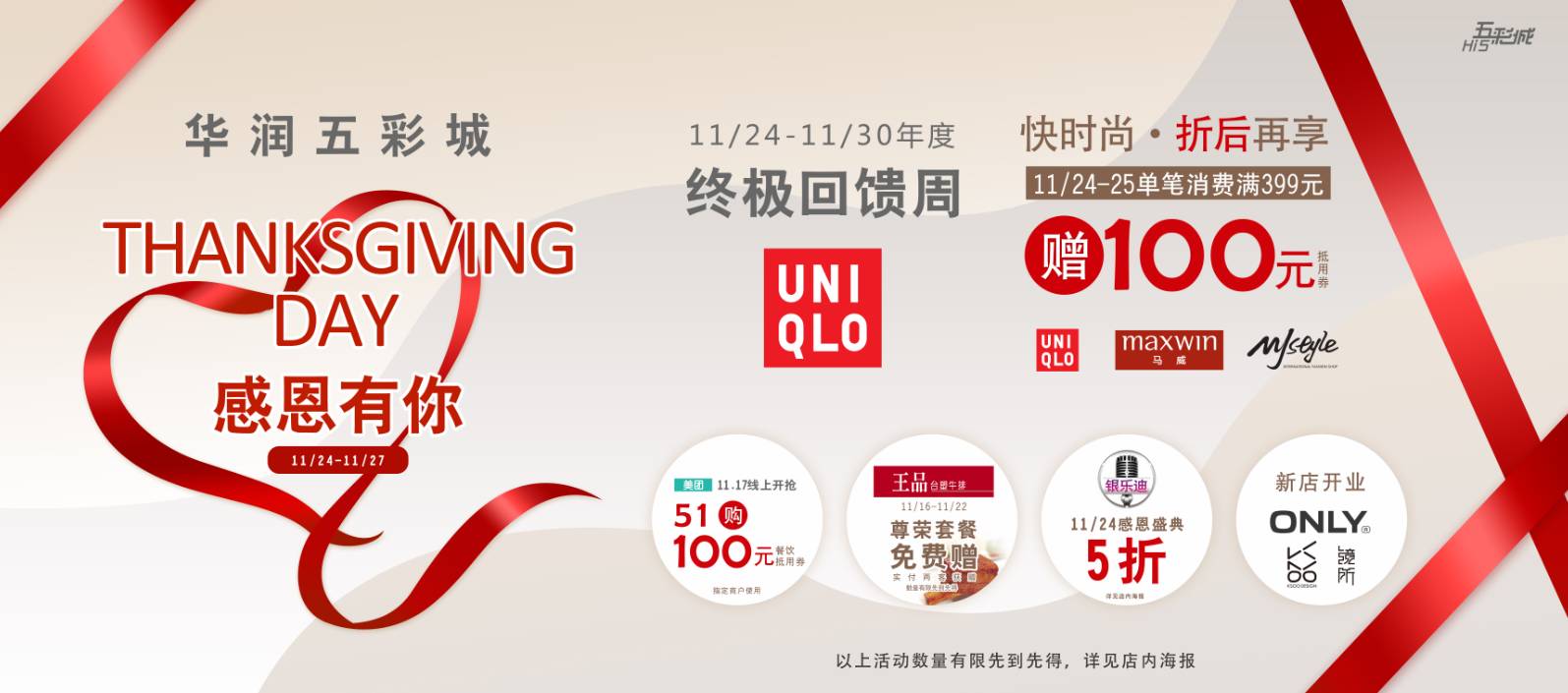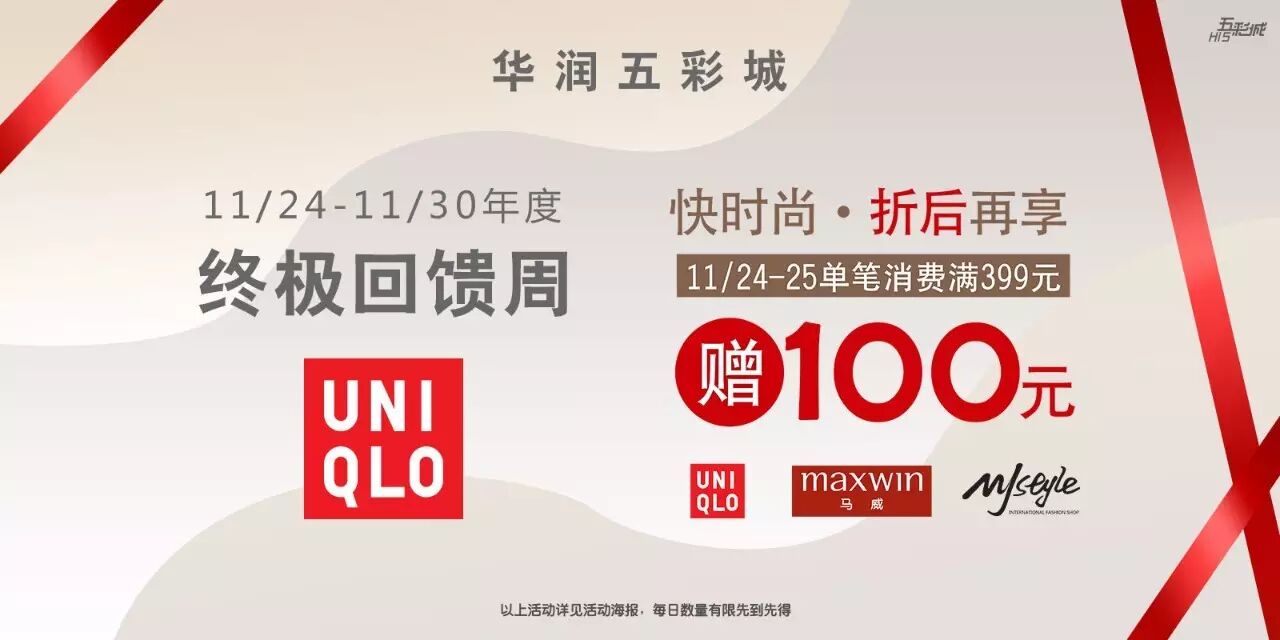 ■活动内容:活动期间,在优衣库、MJ、马威店铺单笔消费满399元赠送100元现金券一张(限优衣库、MJ、马威使用),每位顾客每张小票限领一张。数量有限先到先得。