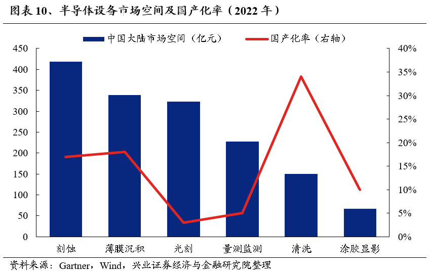 目前半导体设备行业国产替代第一阶段已完成,但部分国产化率仍存较大提升空间,仍处于“卡脖子”阶段。薄膜沉积、刻蚀和光刻设备是最重要的三大前道设备,在清洗、CMP、热处理等领域的国产化率已逐渐起来,但在高端光刻机、量测/检测设备以及离子注入环节,国内替代进展仍较慢。