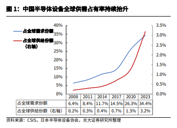 据战略与国际研究中心(CSIS)统计,2020年至2023年,我国半导体在全球供应中的份额从1.3%快速抬升至3.2%,2017年仅0.7%;2023年中国占全球半导体需求的份额高达34.4%,是全球半导体设备的主要市场。