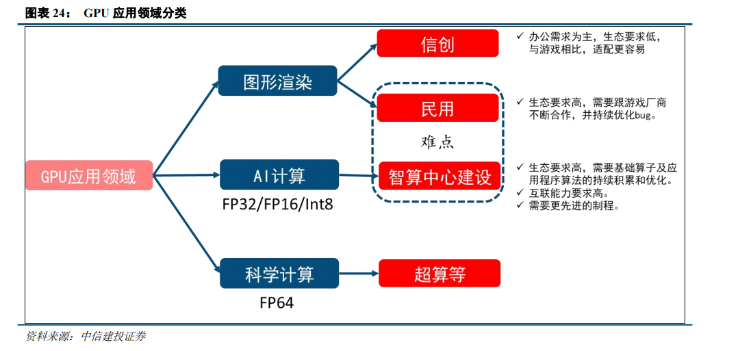 以GPU为例,具有数量众多的运算单元,适合计算密集、易于并行的程序,一般作为协处理器负责图形渲染和并行计算。对于国内来说,民用图形渲染领域买单的人是游戏爱好者,GPU公司需要跟大型游戏厂商进行适配合作,背后的生态支持需要大量工作。对于智算领域,生态要求极高,需要基础算子及应用程序算法的持续积累和优化,其次互联能力要求也极高,并且由于海外对国内使用先进制程有诸多限制,也限制了国内AI芯片的迭代。