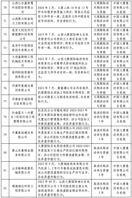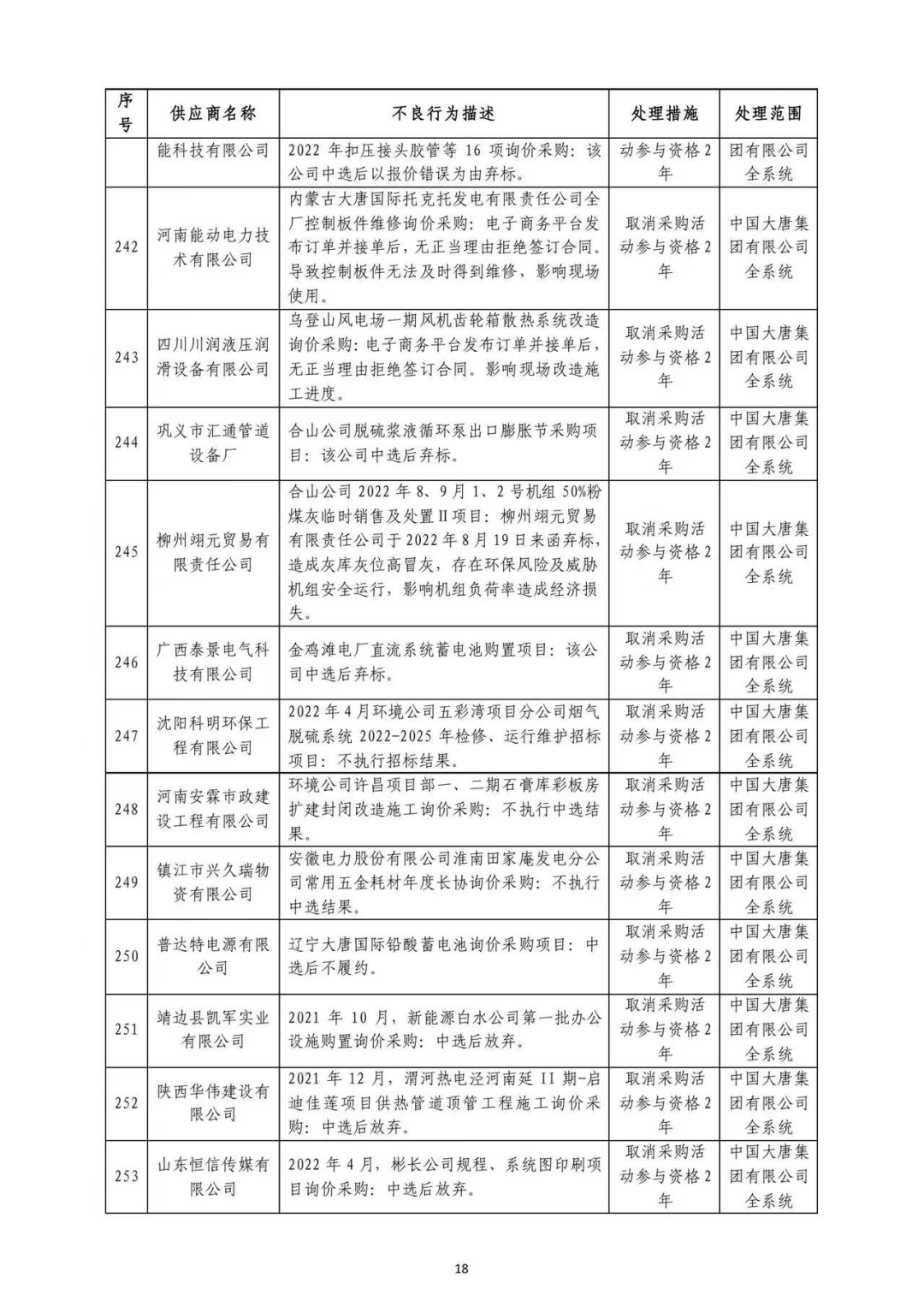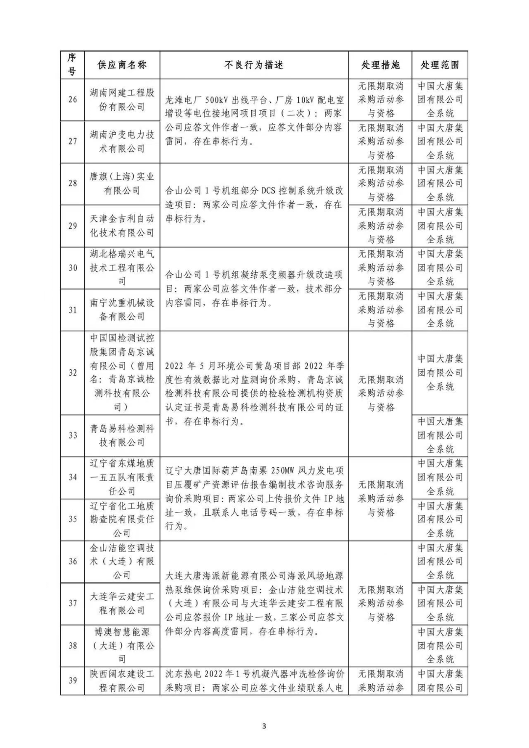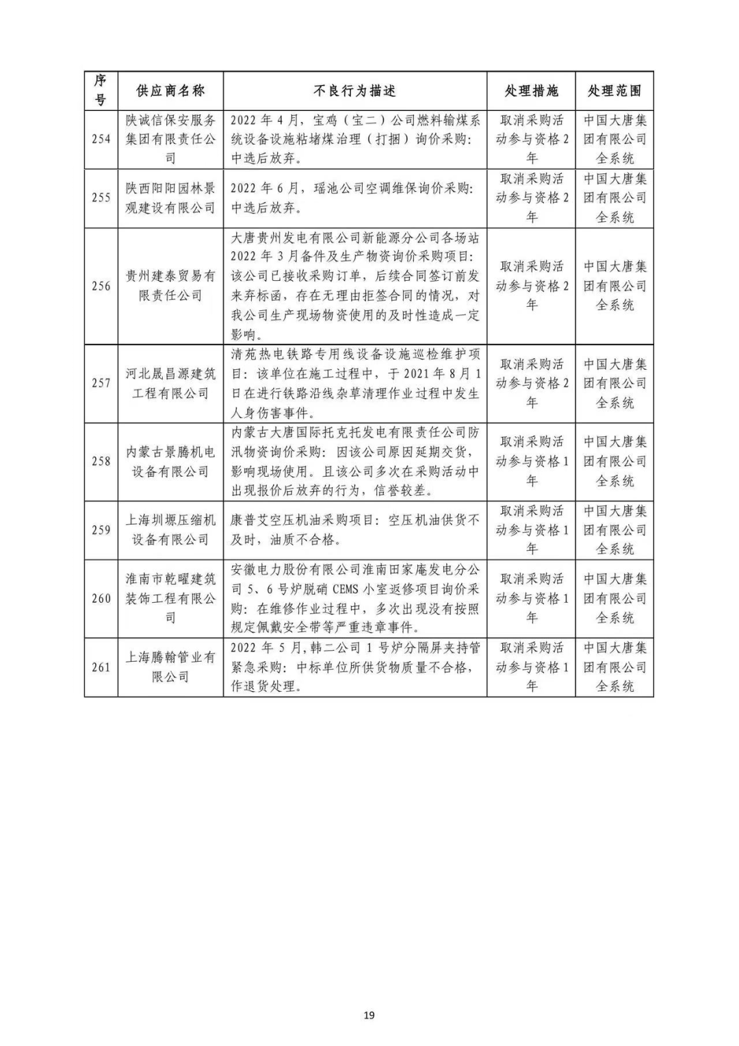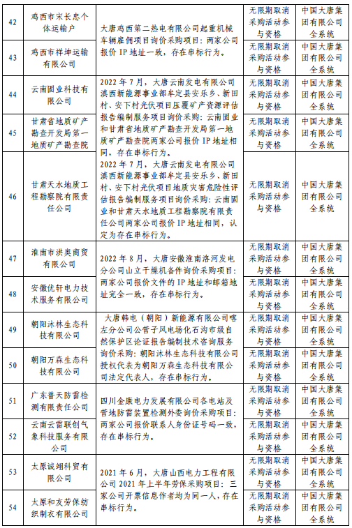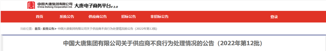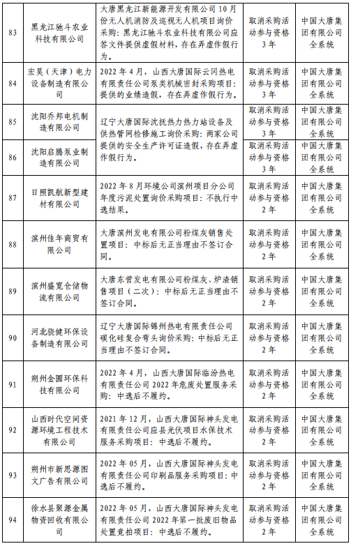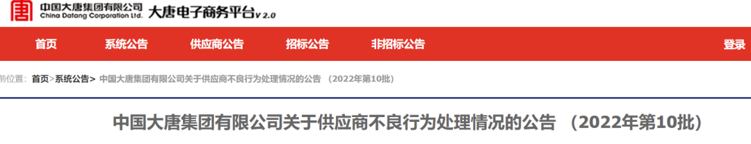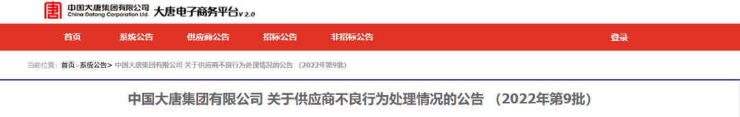 中国大唐集团有限有限公司供应商不良行为处理情况(2022年第9批)