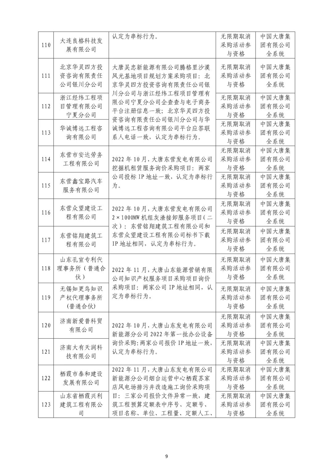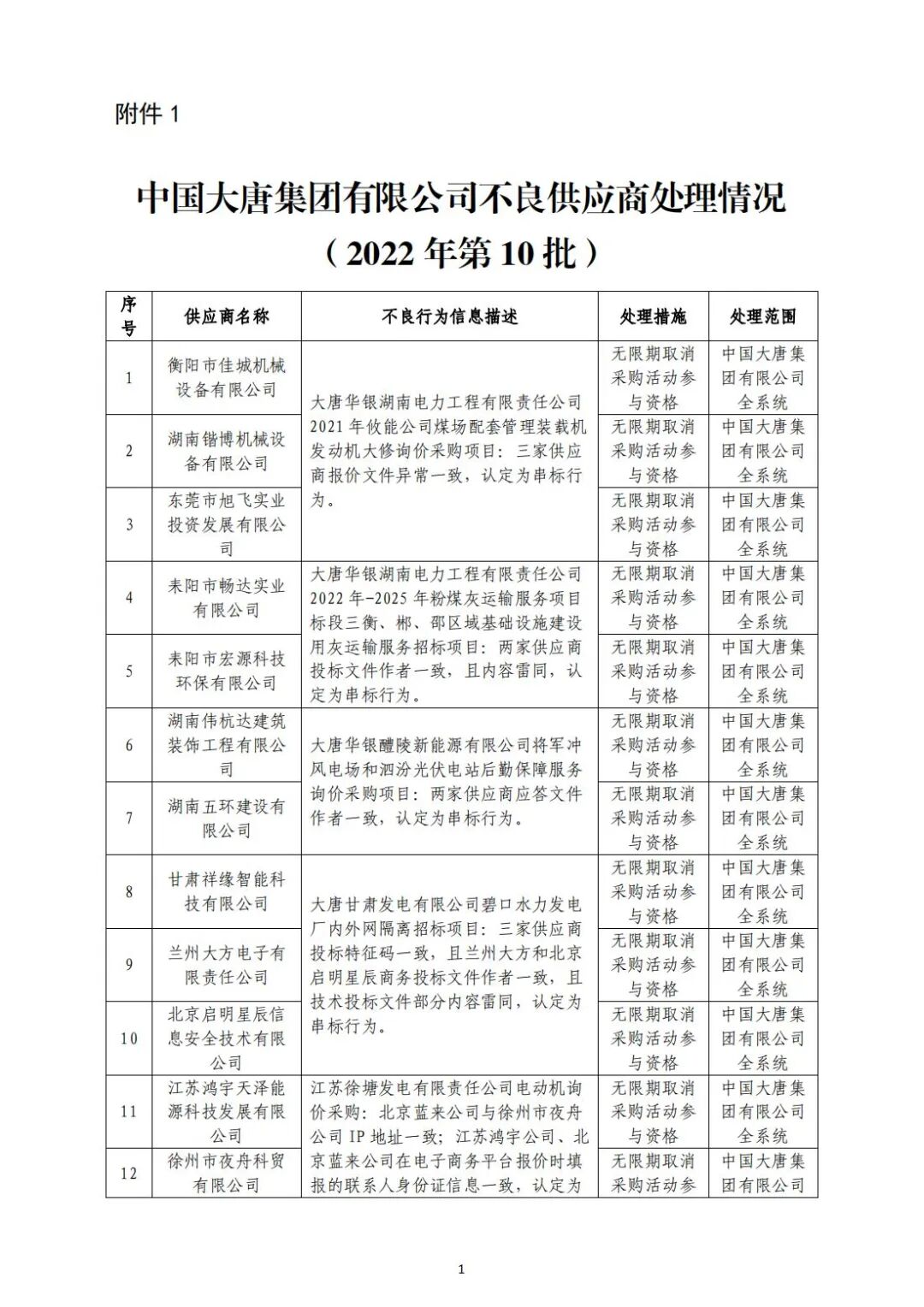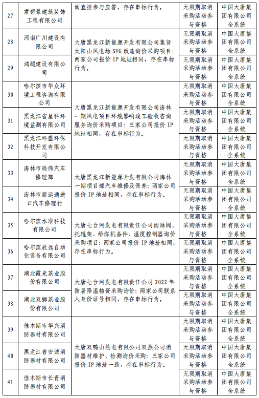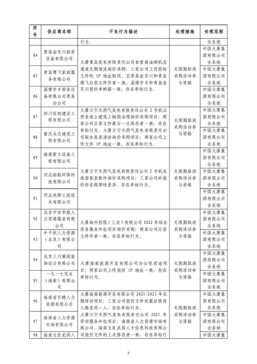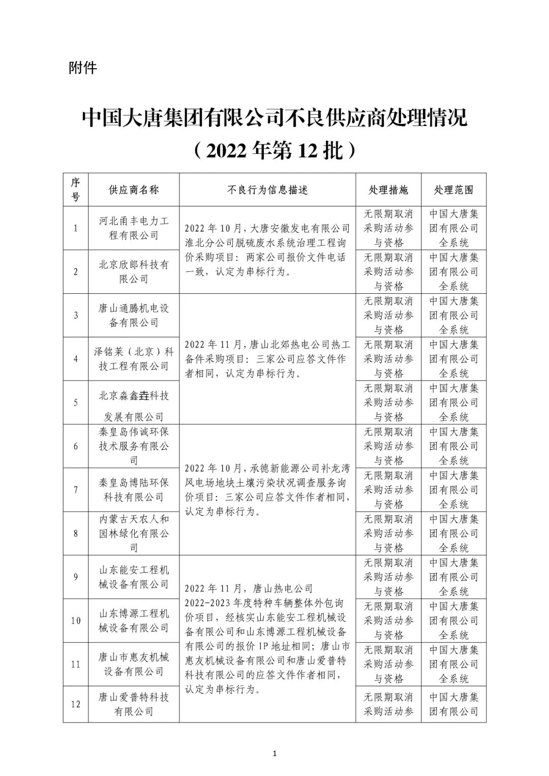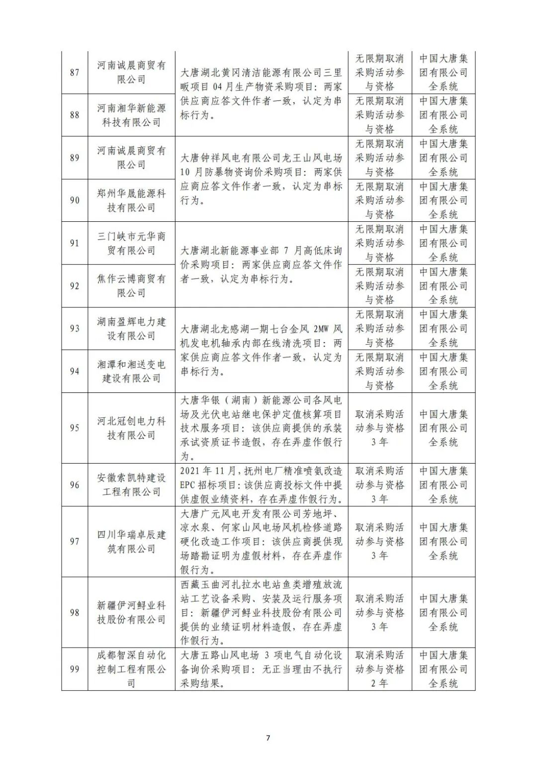 中国大唐集团有限有限公司供应商不良行为处理情况(2022年第9批)