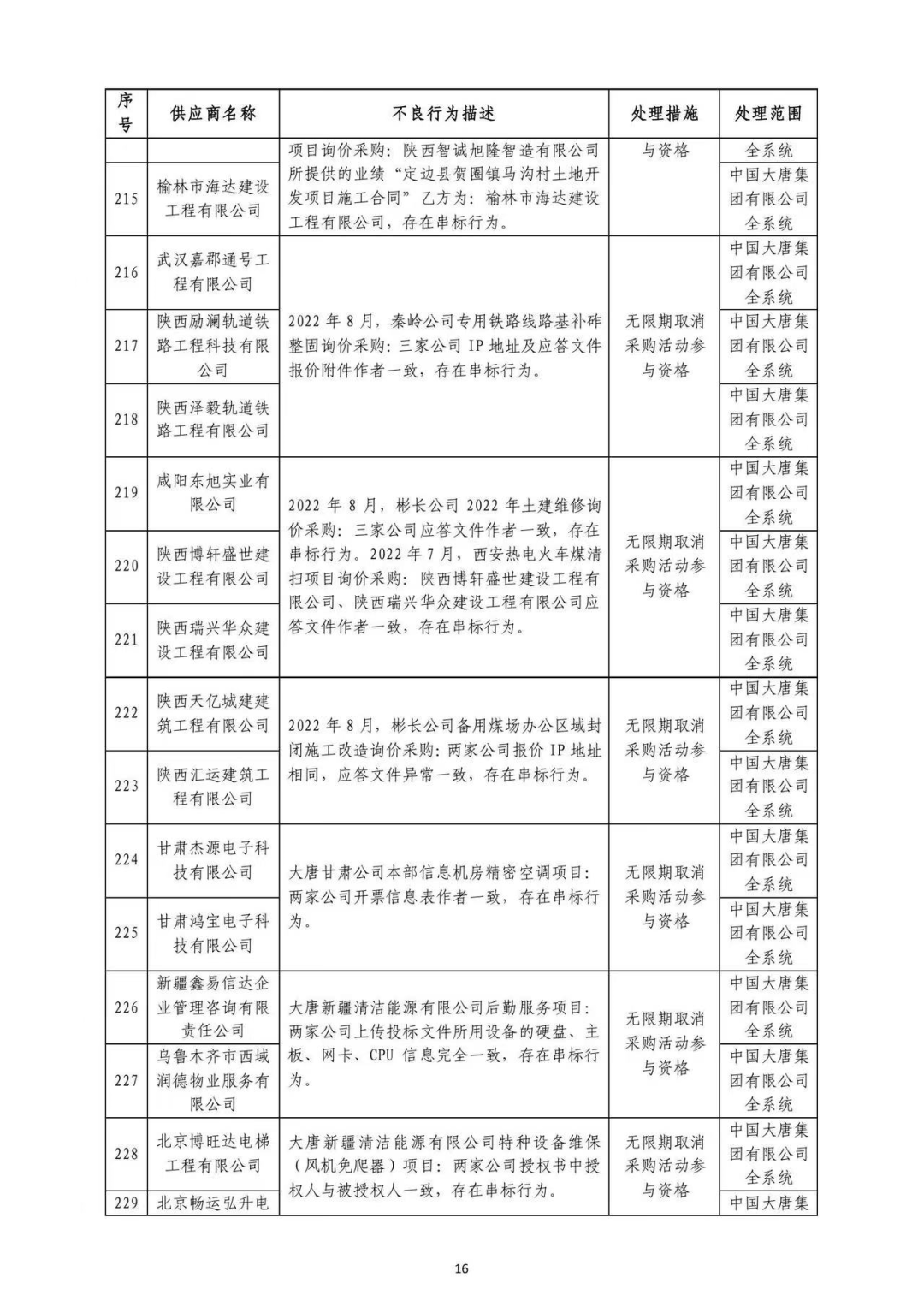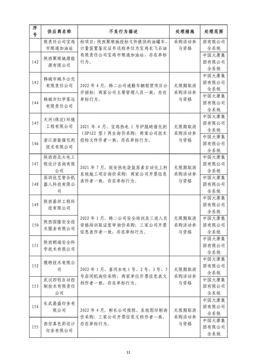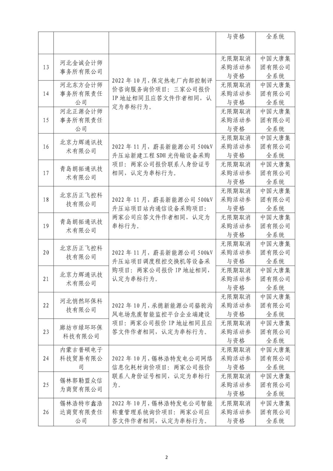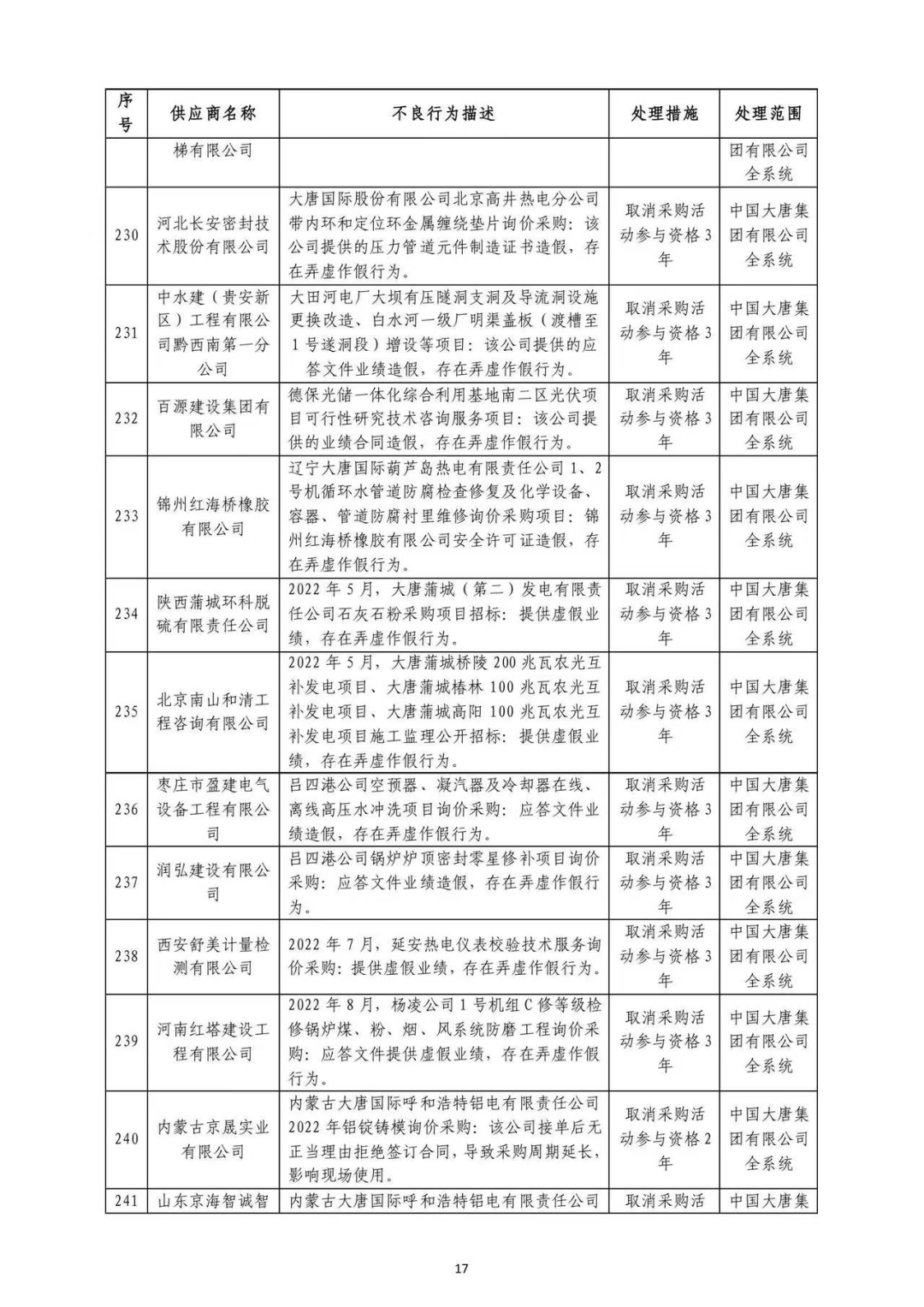 中国大唐集团有限有限公司供应商不良行为处理情况(2022年第9批)