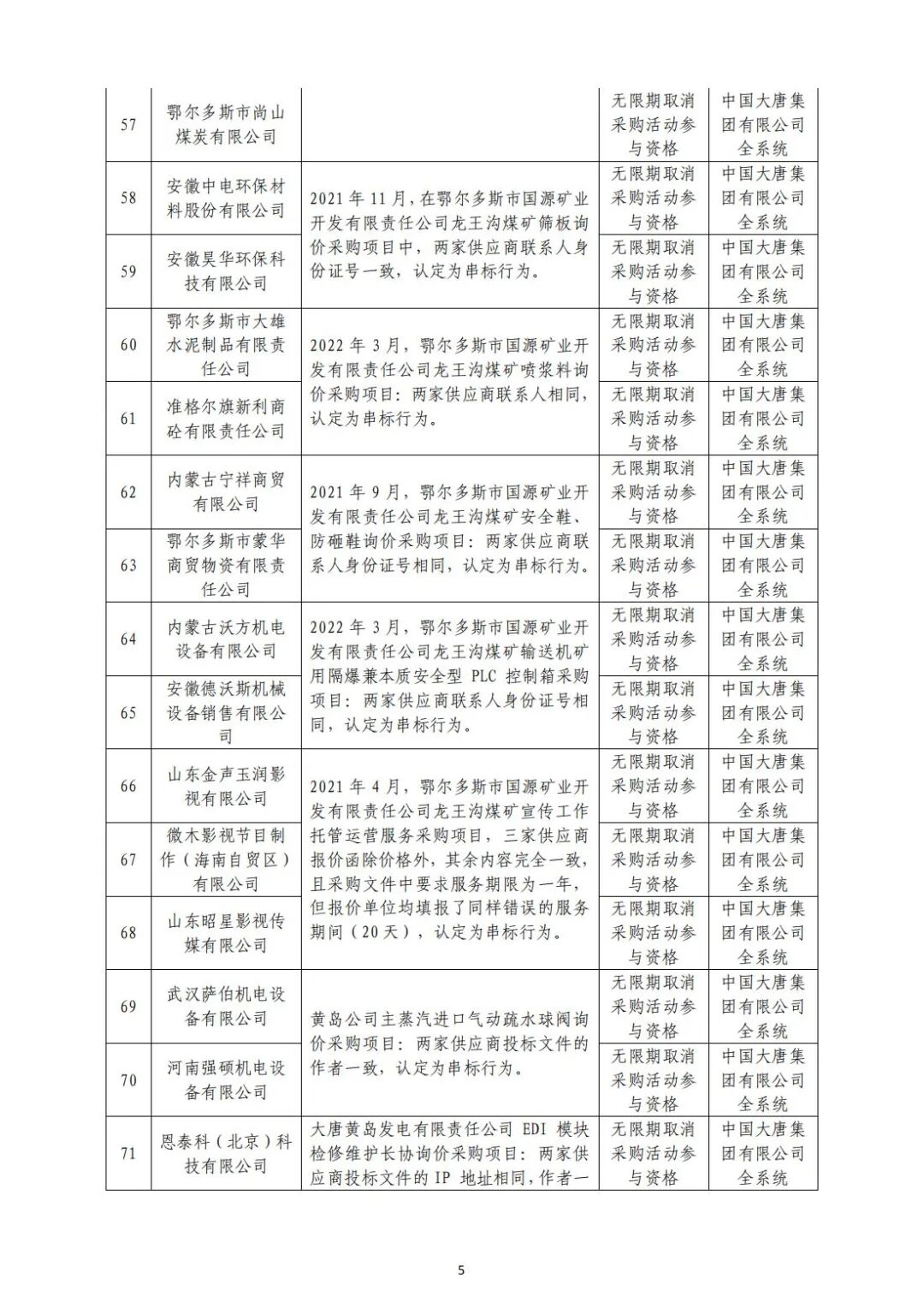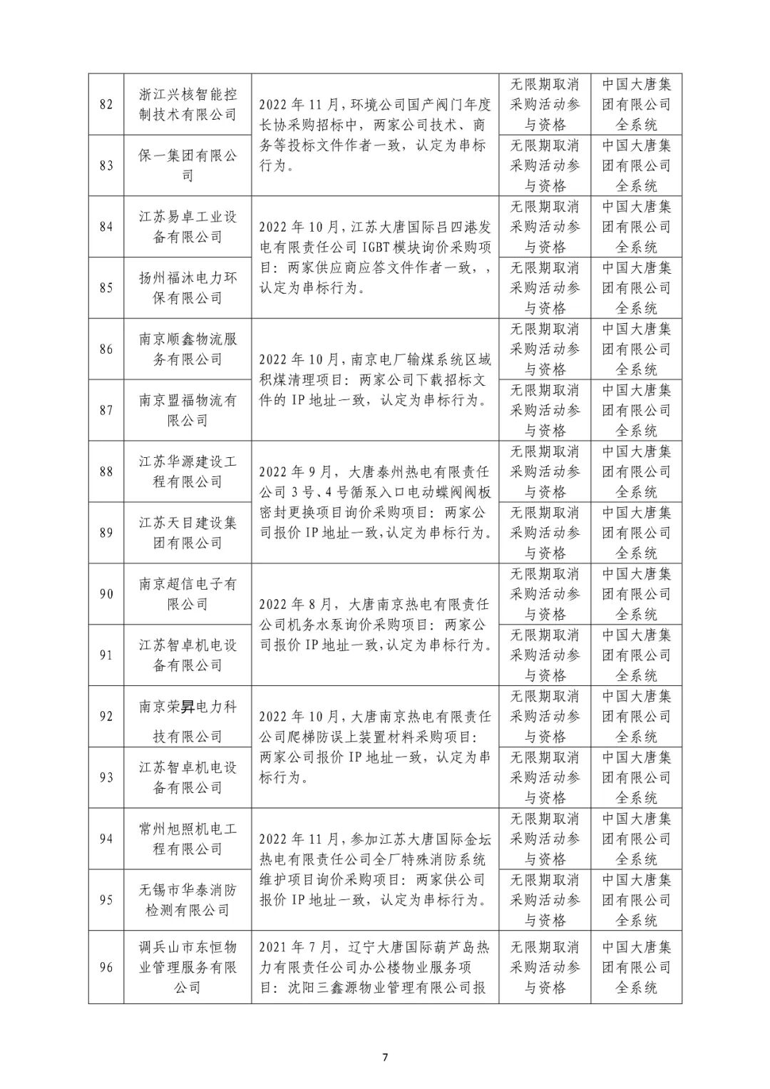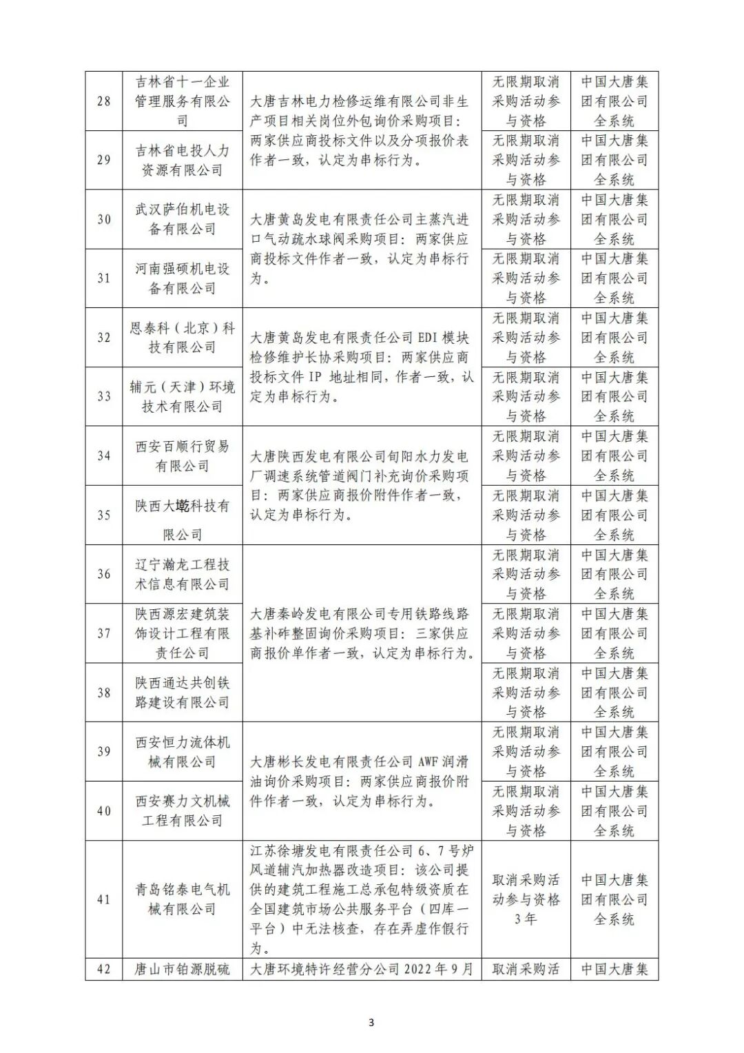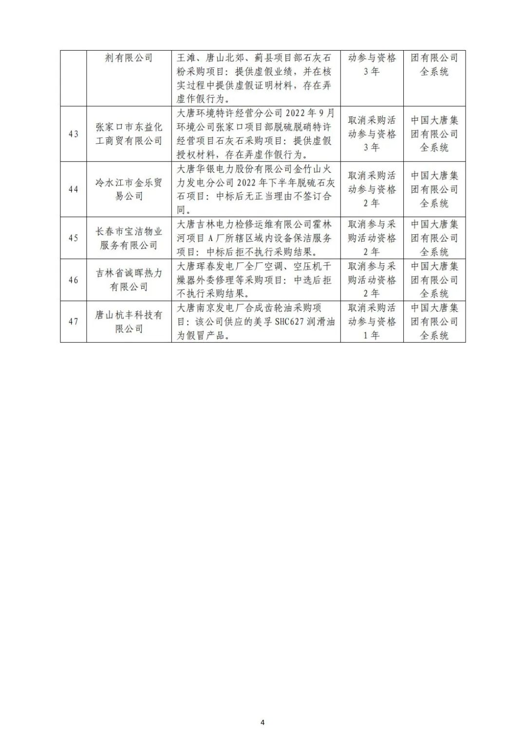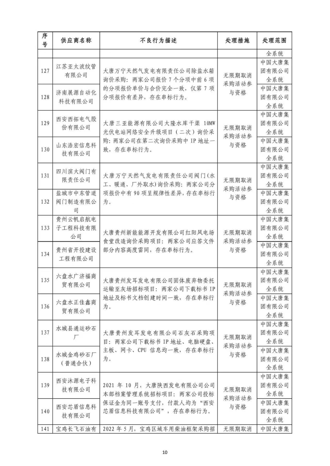 中国大唐集团有限有限公司供应商不良行为处理情况(2022年第9批)