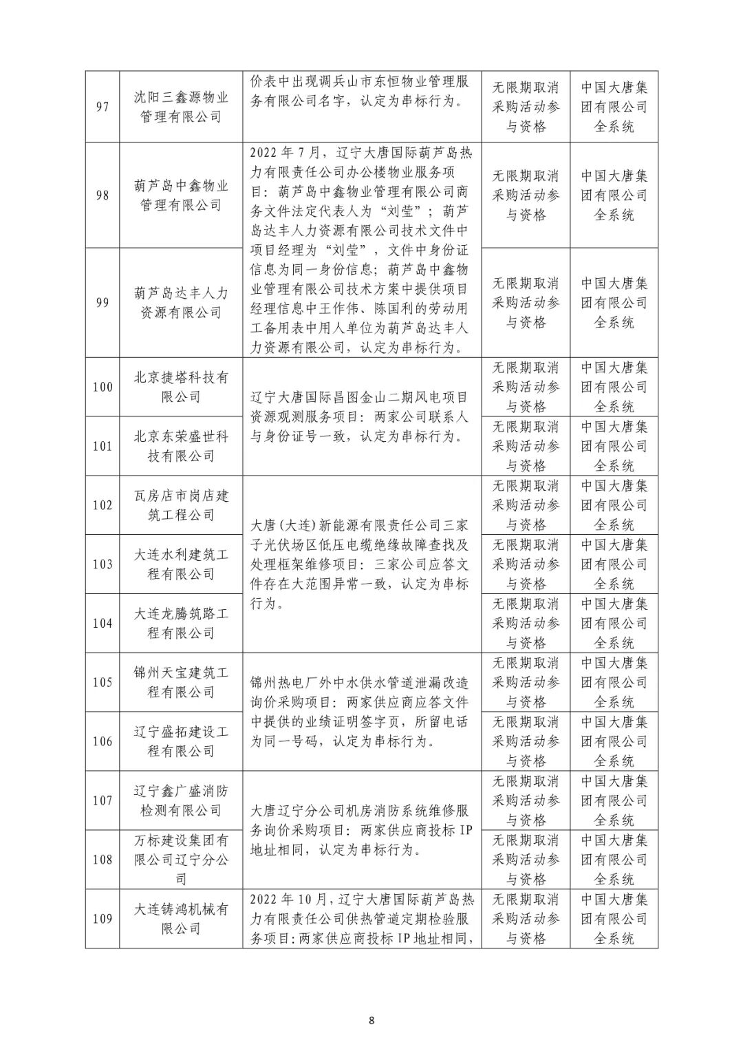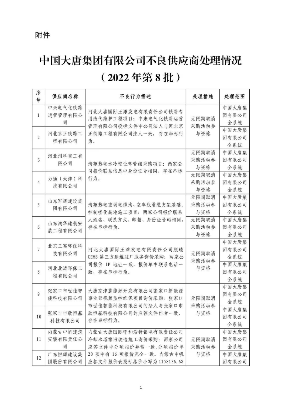 中国大唐集团有限公司不良供应商处理情况(8-12批)
