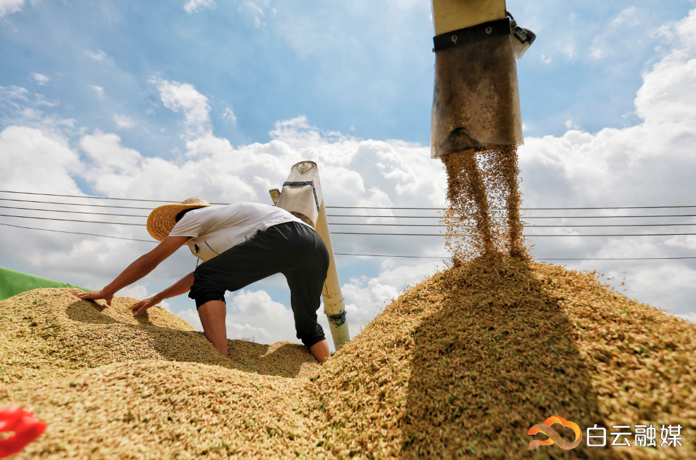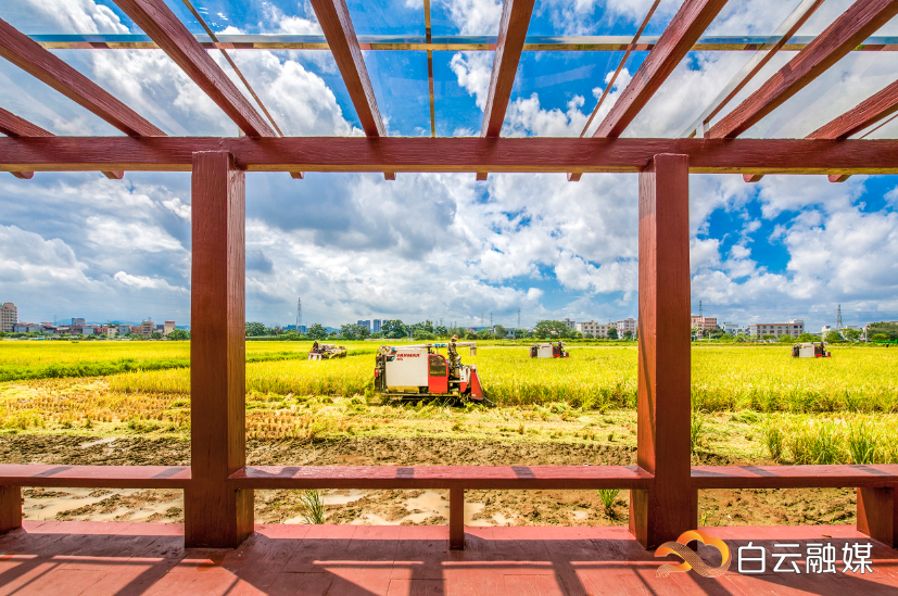 ▲ 十年间,白云区奋力构建现代都市农业产业集群。图为白云水稻收割实现机械化作业