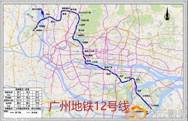 十二号线工程全长37.6公里,共设置25座车站,全部为地下线,起于浔峰岗站,止于大学城南站,途经白云区、越秀区、海珠区、番禺区,其中包括金沙洲、同德围、新市等白云区人群居住密集区域。