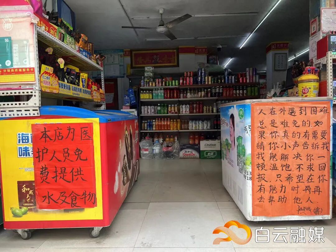 ▲小店门口张贴着为医护人员免费提供水及食物的告示