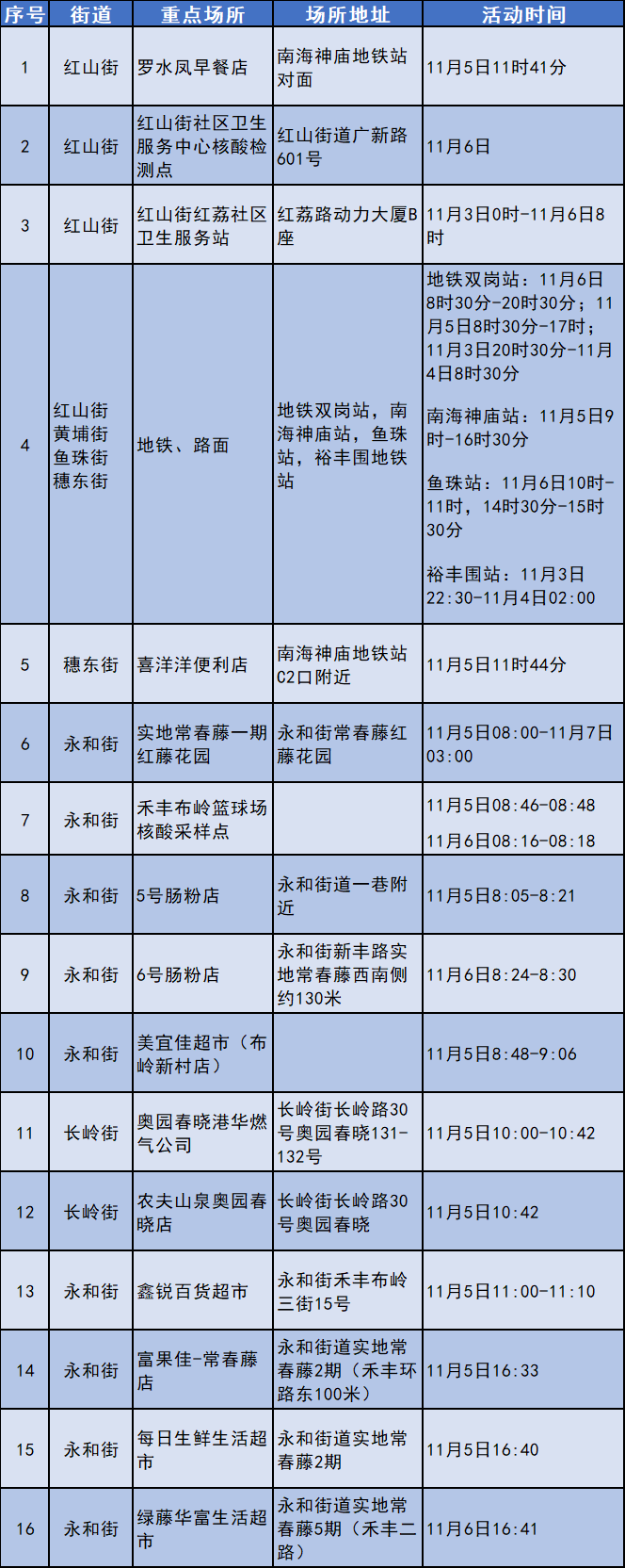 ☉ 萝岗街道:塘头村均南一巷、锐丰中心2栋、锐丰广场核酸采样点、锐丰广场附近(柳州螺蛳粉、雷公子卤粉)、香雪地铁站E、F口、 香雪地铁站附近(喜洋洋便利店、三津汤包、正品港式便利店、小霞包点)、惠美家24小时百货店(萝岗公路街店)。