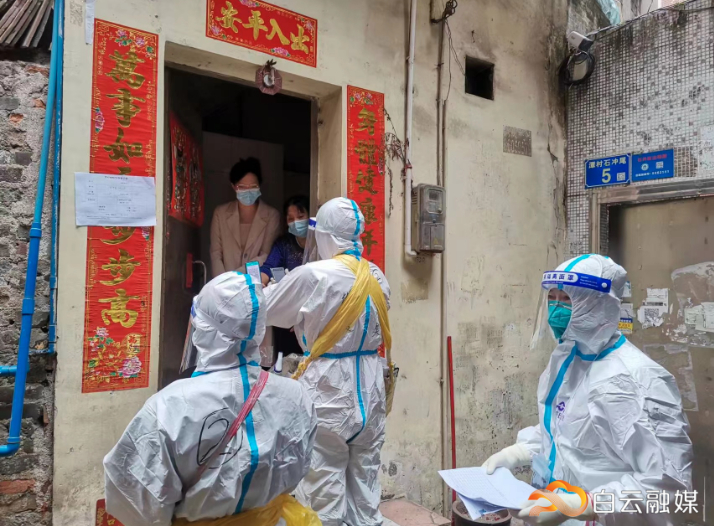 ▲ 热心居民贺全玉(右一)就地化身志愿者,充当上门核酸采样队伍的“引路人”