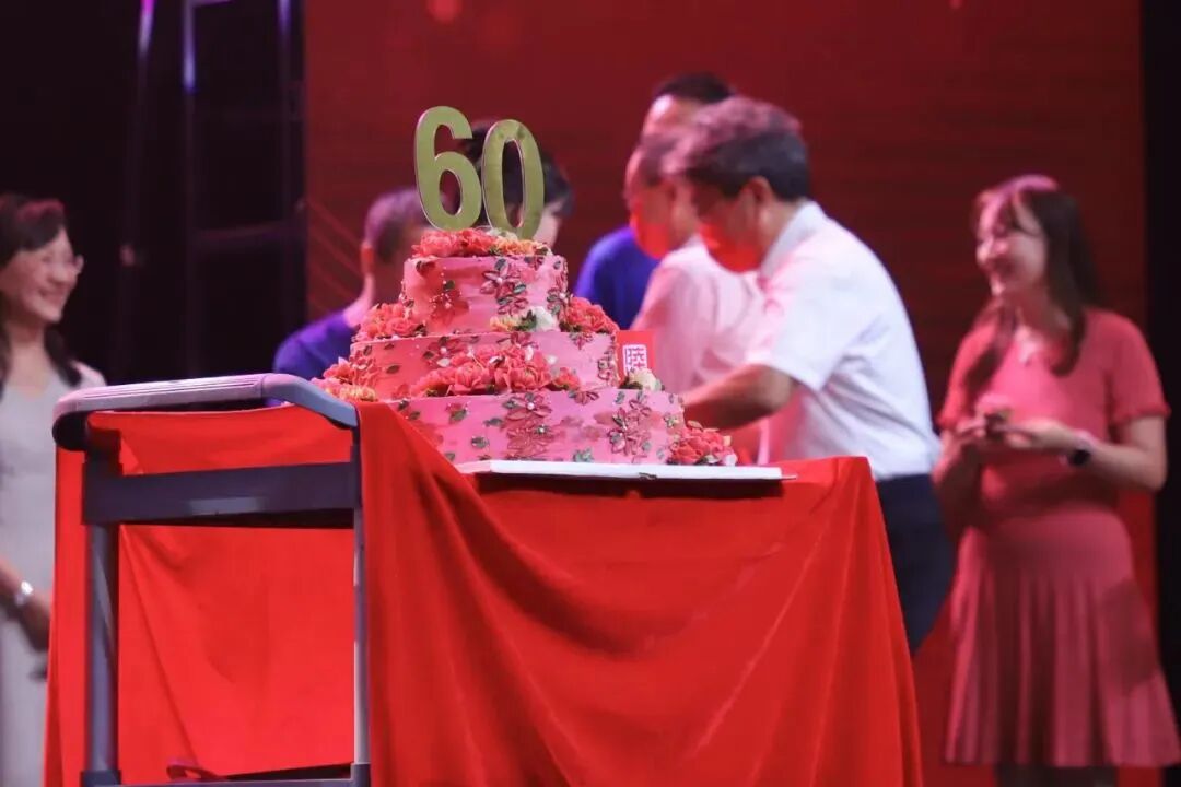 接着,晚会迎来了最高潮——庆生仪式!象征着北语60周年团结和奋进,迎来丰收与喜悦、幸福和美满的生日蛋糕被推上舞台,倪海东书记和刘利校长在全场的欢呼声和掌声中切开生日蛋糕。全体校领导为台上的师生校友代表赠送校庆专属蛋糕,与大家分享甜蜜与祝福,把这份幸福和殊荣,带给每一位北语人。
