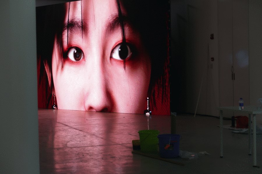 一旁的LED电子巨幕,放映陆扬的录像作品《独生独死,Hello World》,她身着机器人电子样式的服装,用机械一般的动作与神态,超越时间空间的束缚,延展创造的维度,红色背景与蓝色灯光形成鲜明的对比。作品跳脱语言文化的障碍,突破艺术娱乐商业的界限,呈现数字时代的无限可能。