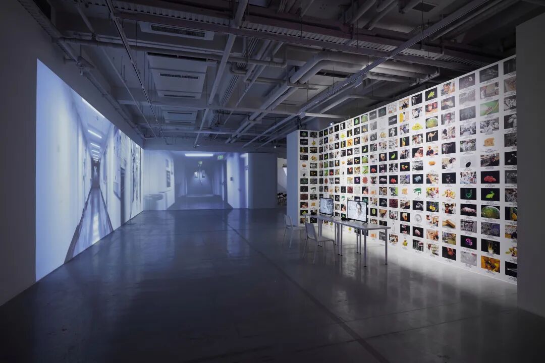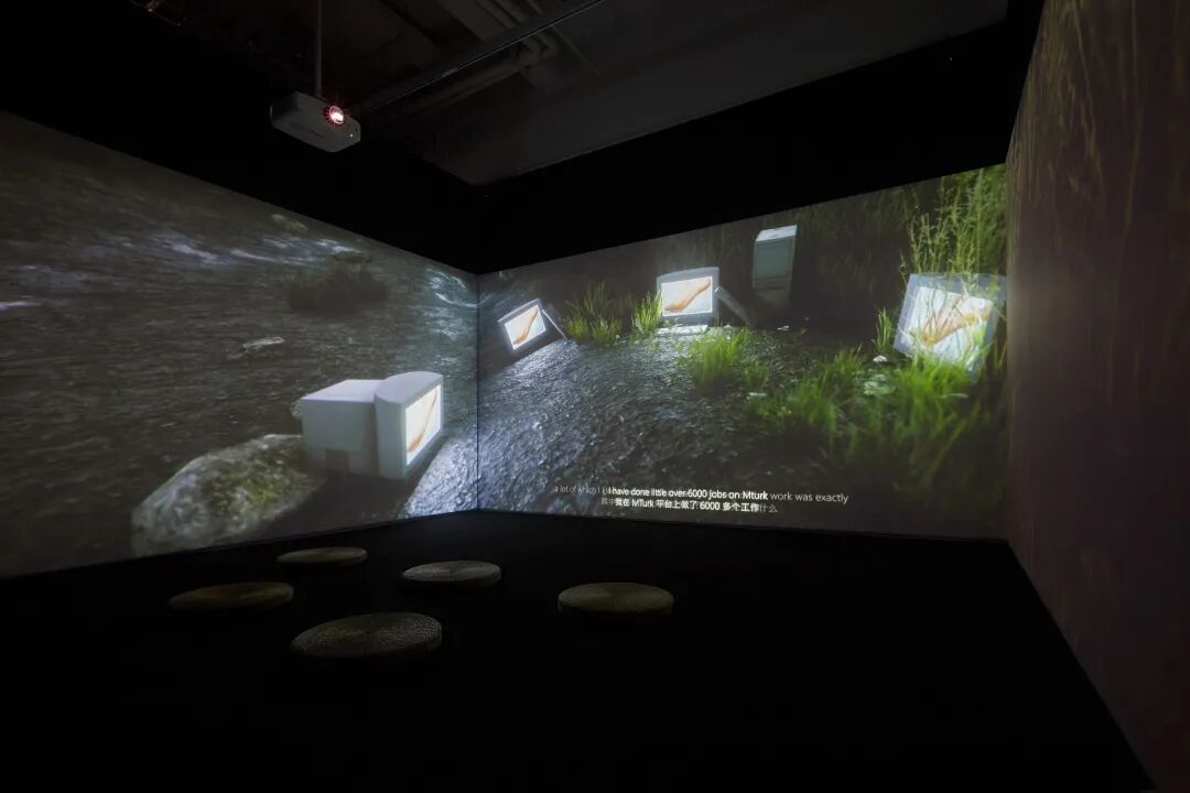 穿过回形空间,是林博彦的多频影像装置《人类劳动力的高速公路》,分别播放着不同工人将工作台显示器关闭后,聚焦手机摄像头,直至拍摄到整个工作台面。十几个显示器漂浮般悬挂于镜面通道中,如同幽灵般的存在体被禁锢在狭小屏幕中。