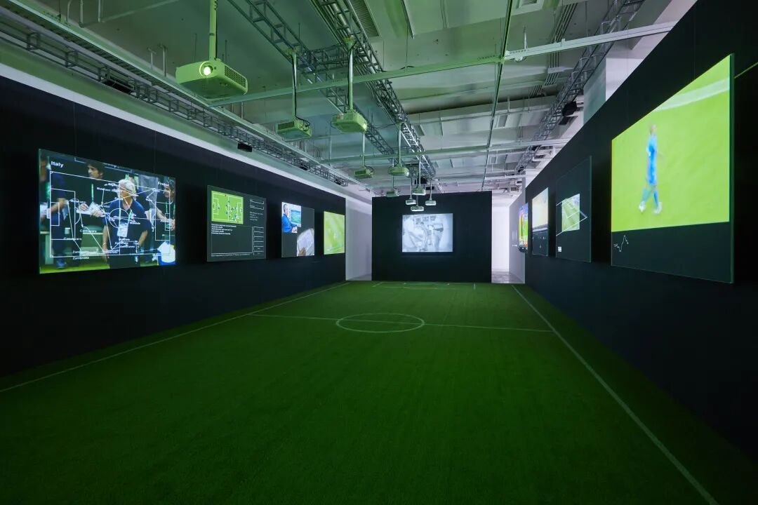 众所周知,足球是我们的生命。而就像对待生命一样,我们一直努力加强对它的把握。讽刺的是,我们屡战屡败,却屡败屡战。位于展厅末端的室内“足球场”来自哈伦·法罗基的《深度游戏》,作品由2006年世界杯各个视角的画面构成。在球场这方天地内,球员踢球、传球、接球和跑动背后的思维网络,蕴含无限的复杂性。而在观看过程中,仿真式纪录、电影、电视、电子游戏爱好者和追随者之间的距离被无限拉近。