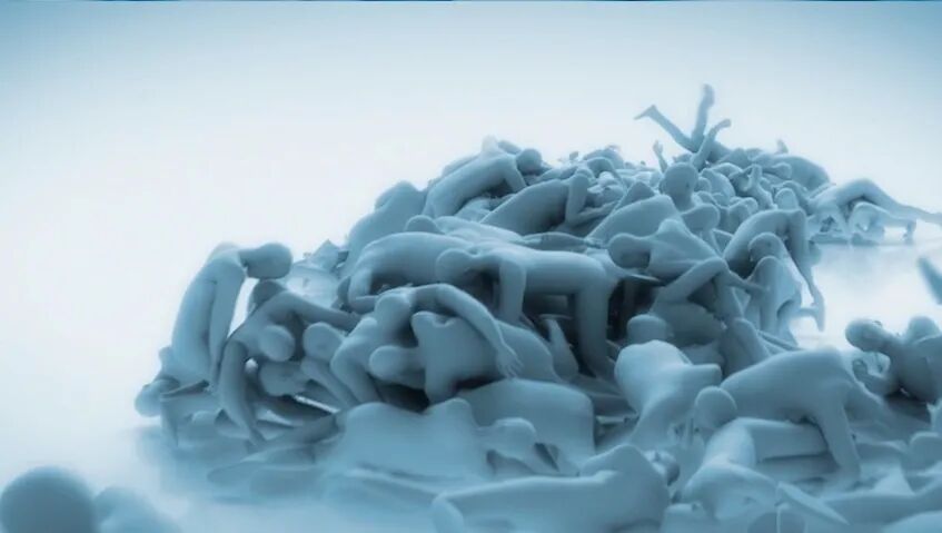 《阳光下的灾难》(Disasters Under the Sun,2019)上半部分的影像内容基于作品《可怜的魔法》(Poor Magic,2017),艺术家采用好莱坞电影常运用的计算机生成人群模拟技术,想象了一个反乌托邦的科幻未来——人类不再有具体的物理形式,而是被上传到服务器上以AI的形式永久地存在,超越了物质性。在这个科幻世界中,人类虽然获得了永生,却被邪恶的AI不断地折磨。