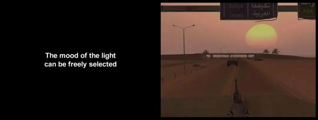 “2009年秋天,我们在加利福尼亚州的海军陆战队29棕榈基地拍摄了一次演习。坐在教室的四名海军陆战队员代表坦克队中的成员。他们用面前的笔记本电脑驾驶自己的坦克,并观看队中的其他人驾驶坦克经过计算机动画生成的景观。游戏中模拟的阿富汗人的形象是从阿富汗的地理数据中提取的。计算机景观中的街道就像在真正的阿富汗一样;每一棵树、地面上的植被或山脉都是如此。指导员放置爆炸装置并将叛乱分子也放置在该地区。一名狙击手射击了坦克炮手,我们用相机记录了这一刻。当坦克驶过土地时,它带起了一阵灰尘。植被越多的地方灰尘越少,而在柏油路上没有灰尘。即便对细节倾入了全部的关注,电脑游戏中的死亡仍然与现实有所不同。”哈伦·法罗基自述道,“同样,在29棕榈基地,我们开展了一项有300名‘群众演员’的演习,他们代表了阿富汗和伊拉克人民。几十名海军陆战队员在岗并巡逻。进行演习的城镇在沙漠中略有抬升,其建筑物由集装箱制成。这个现实世界看上去就好像是计算机动画生成的一样。”