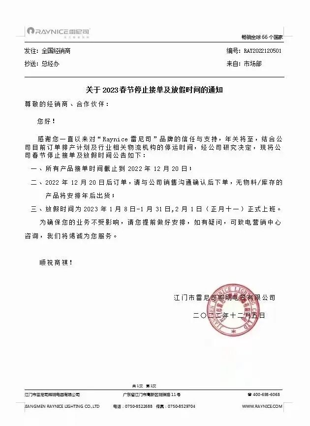 12月5日,雷尼司照明发布《关于2023春节停止接单及放假时间的通知》称,年关将至,结合公司目前订单排产计划及行业相关物流机构的停运时间,经公司研究决定,现将公司春节停止接单及放假时间公告如下: