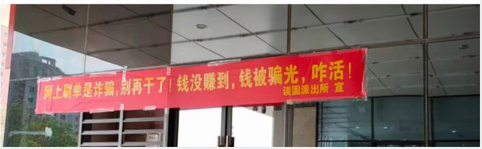 当横幅越挂越多,带给居民的思考也越来越深刻:如果骗子集团选择的是自己而不是他人,那么自己能躲得过吗?