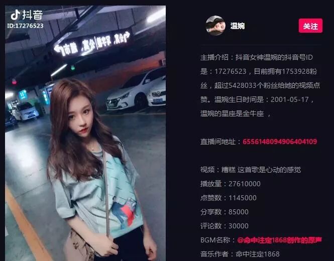 比如说抖音很多的“温婉”,只有17岁的她在视频里是网红脸和尖下巴,一条视频在抖音一炮而红。