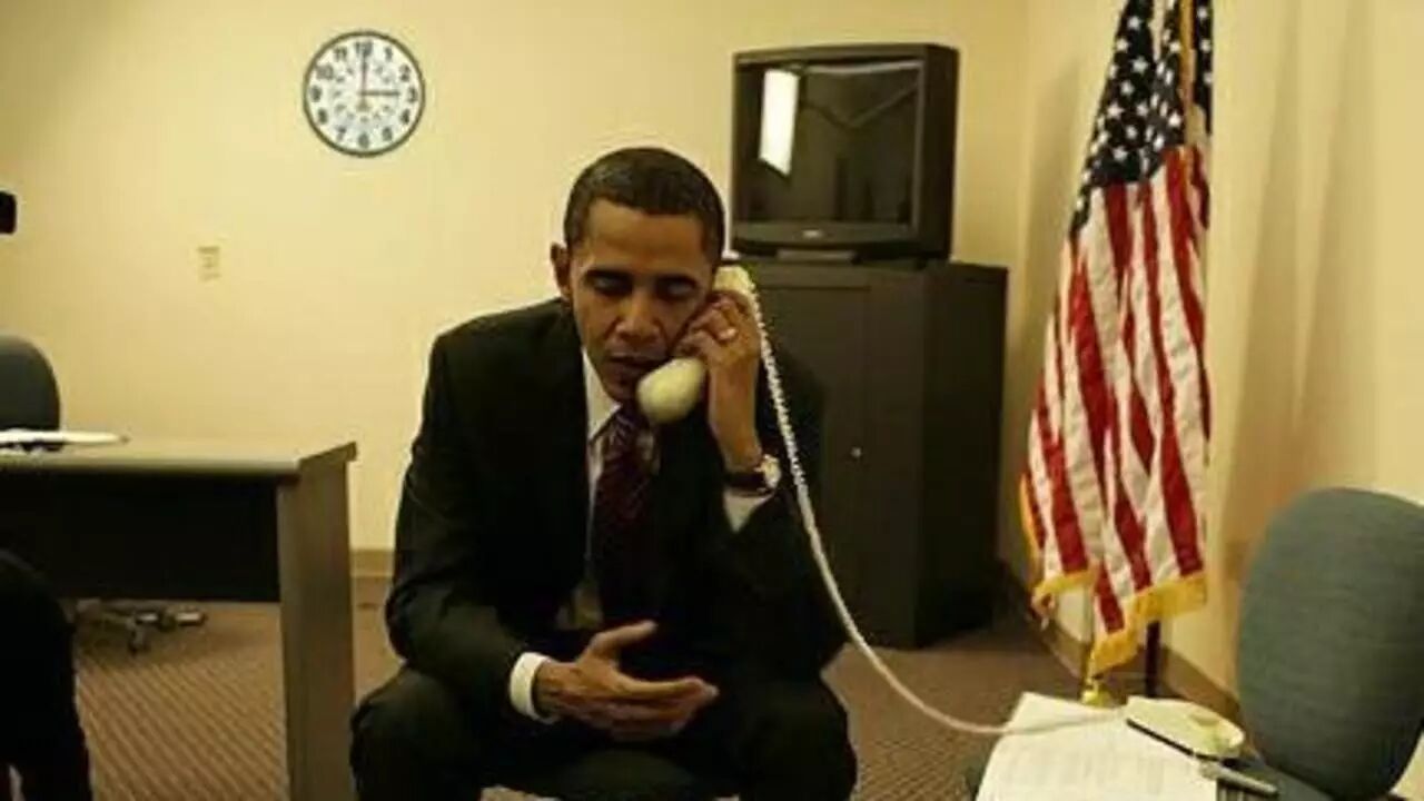 该照上是巴拉克·奥巴马(Barack Obama),传于2008年间。但照片却是假的——照片上的时钟即是线索,指希拉里·克林顿(Hillary Clinton)在三点整打电话的某电视广告。图源:Snopes