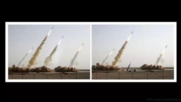 甚至政府也免不了发布虚假照片,尤为著名的一个例子是,2008年伊朗发布一张导弹测试图片,本来测试中一枚导弹极可能是发射失败,但通过巧妙地复制粘贴,在照片上看似已经发射成功(见下图)。法里德提醒说,政府作关键安全决策时,若需要用到朝鲜、伊拉克和叙利亚等国传出的照片,就必须尽可能确认照片的真实性。